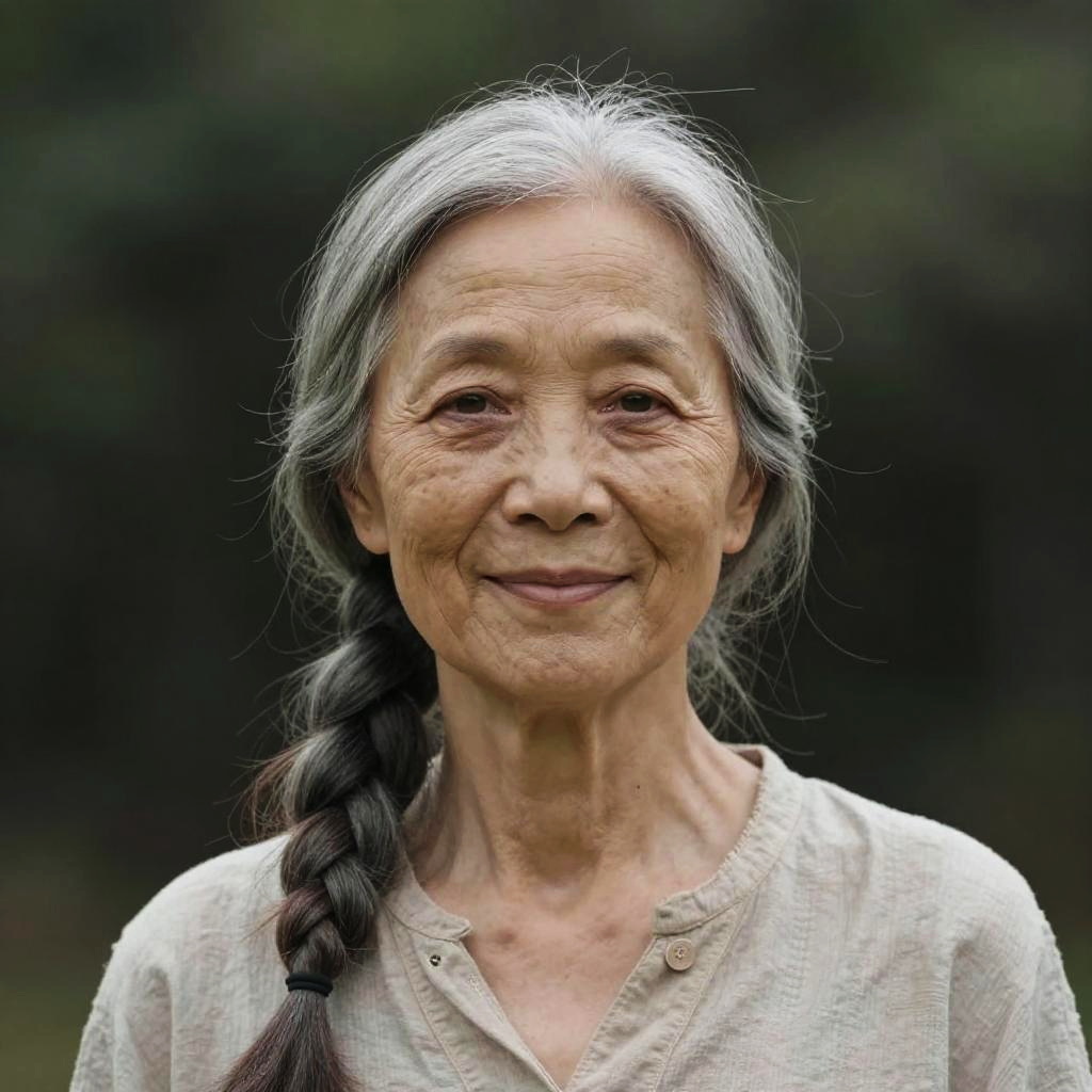 Photograph of an elderly Asian woman with long gray hair in a braid, wearing a beige button-up shirt, smiling softly against a blurred green background