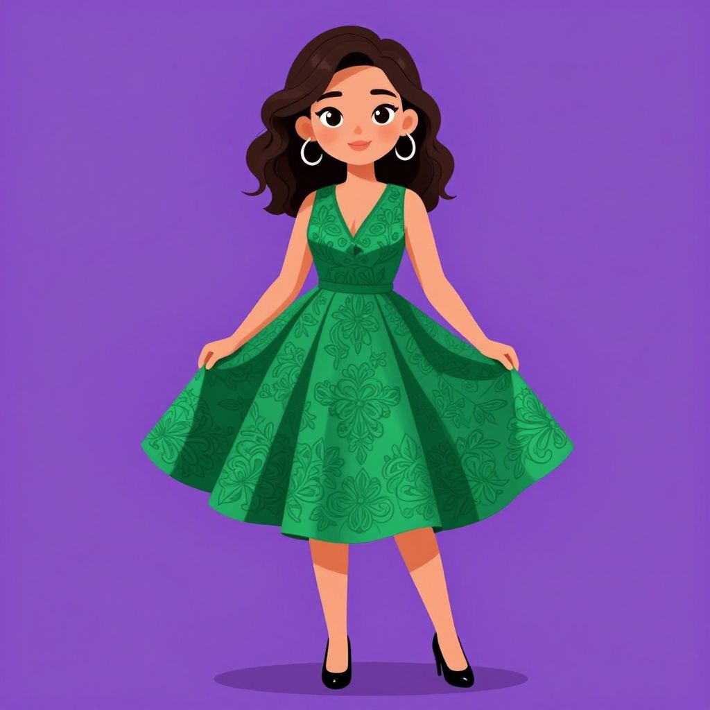 Digital illustration of a young woman with fair skin and dark brown, wavy hair. She has large, expressive eyes and wears white hoop earrings. Her outfit consists of a sleeveless, V-neck, green dress with a floral pattern and a full, flared skirt. She holds the skirt out with both hands, revealing black high heels. The background is solid purple, contrasting with her green dress. The style is cartoonish with bold colors and simple, clean lines.