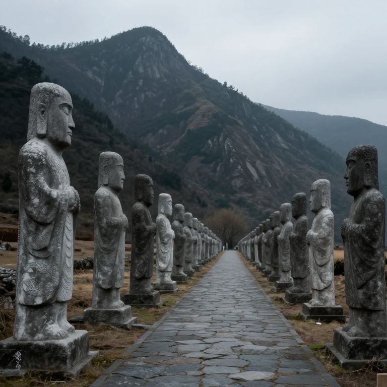 A solemn procession of stone figures stands eternally vigilant along a path that vanishes into the embrace of towering mountains, evoking a profound sense of timelessness, solitude, and the quiet resilience of enduring spirits.