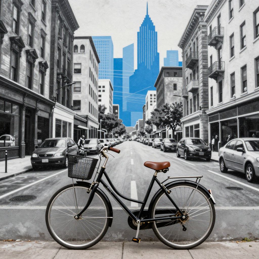 A vintage-style black bicycle with a brown seat and front basket parked in front of a large urban wall art mural. The mural features a black and white city street scene with old buildings, parked cars, and a blue geometric design representing city skyline elements. The scene combines classic and modern urban aesthetics.