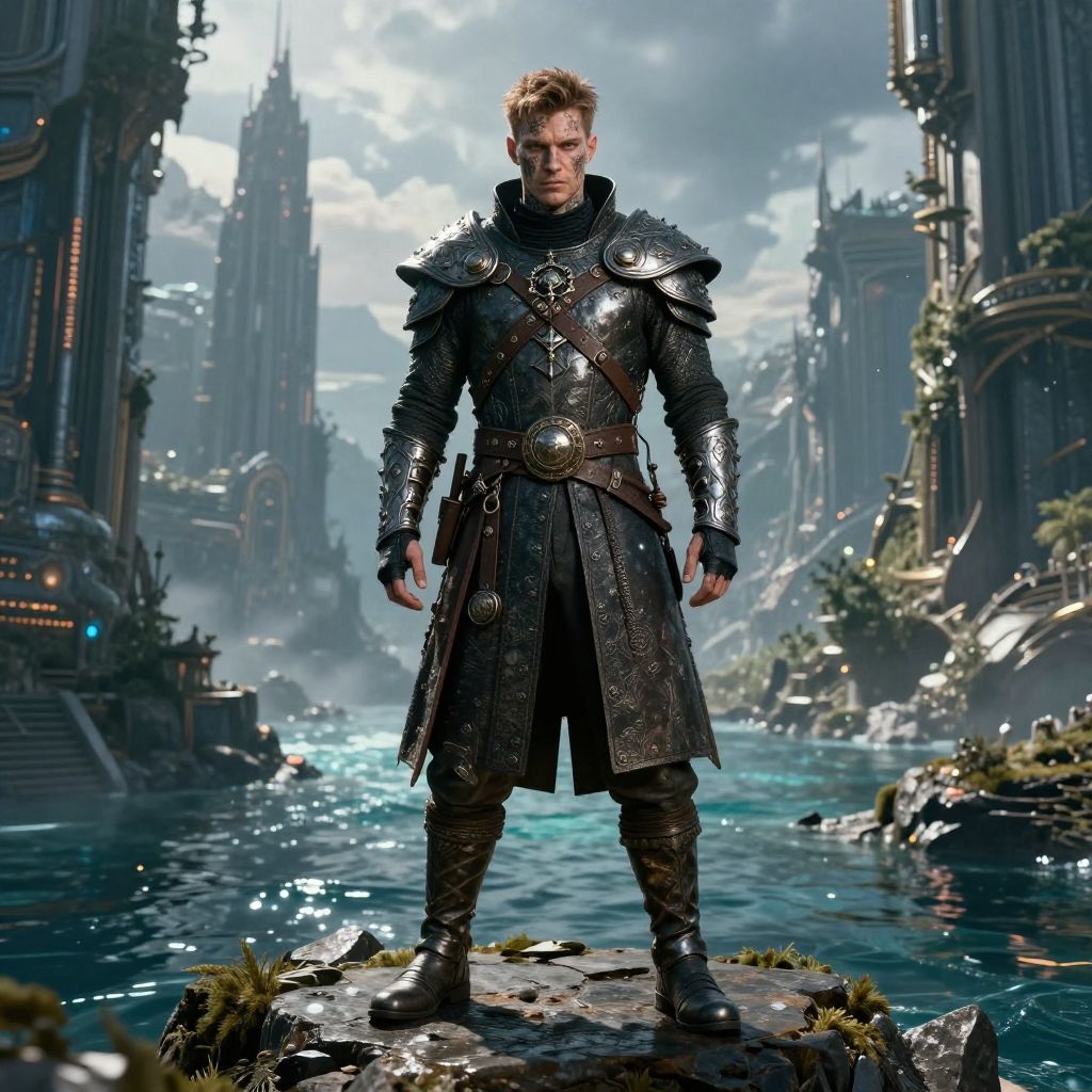 A digital fantasy artwork of a muscular, blonde-haired man standing confidently on a rock in a futuristic, medieval-style city. He wears ornate, black, metallic armor with intricate patterns, a long leather tunic, and boots. His stern expression is illuminated by sunlight, which reflects off his armor. The background features towering, gothic-style buildings with intricate carvings, a flowing river, and a cloudy sky. The scene is highly detailed, with a mix of natural and architectural elements, creating a blend of medieval and futuristic aesthetics. The man's armor is polished, contrasting with the rugged texture of the rock and the smooth water.