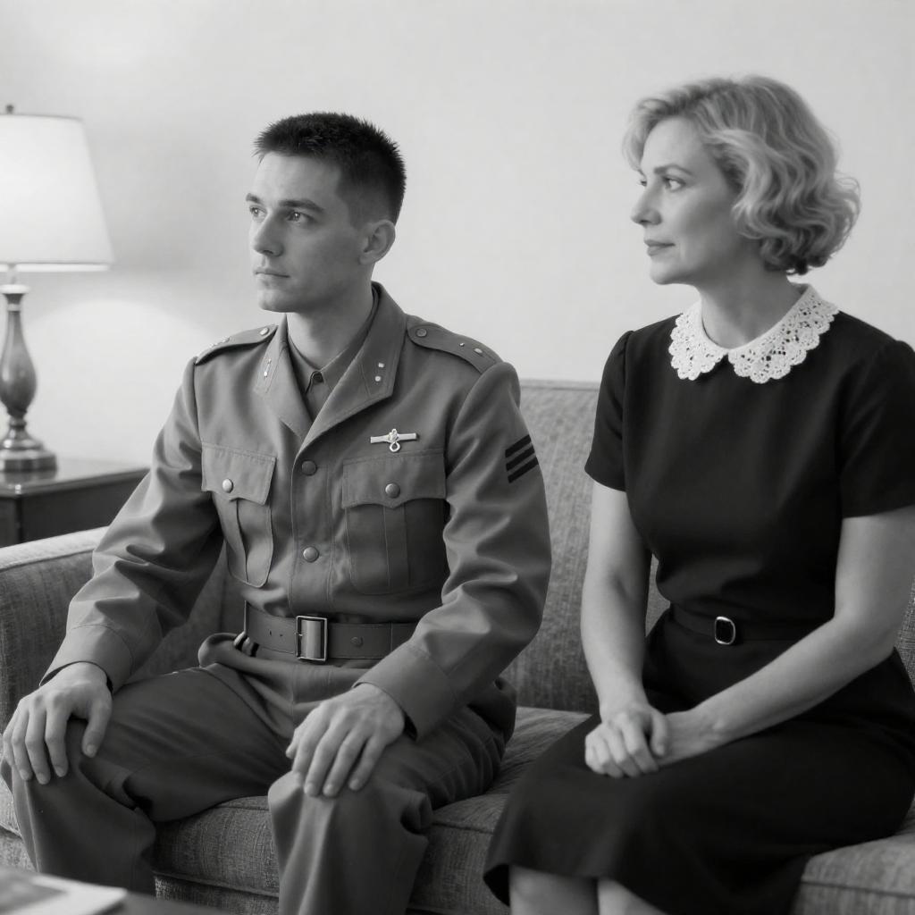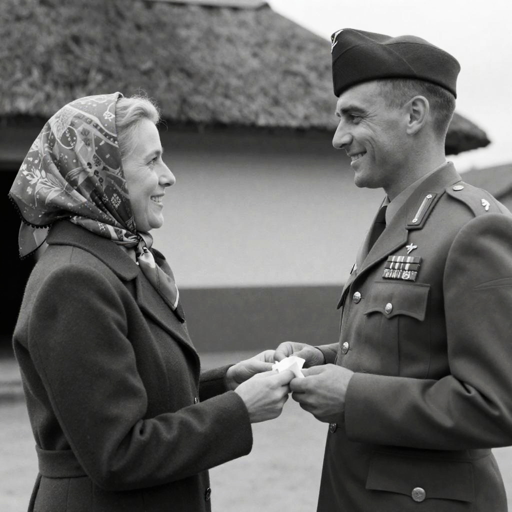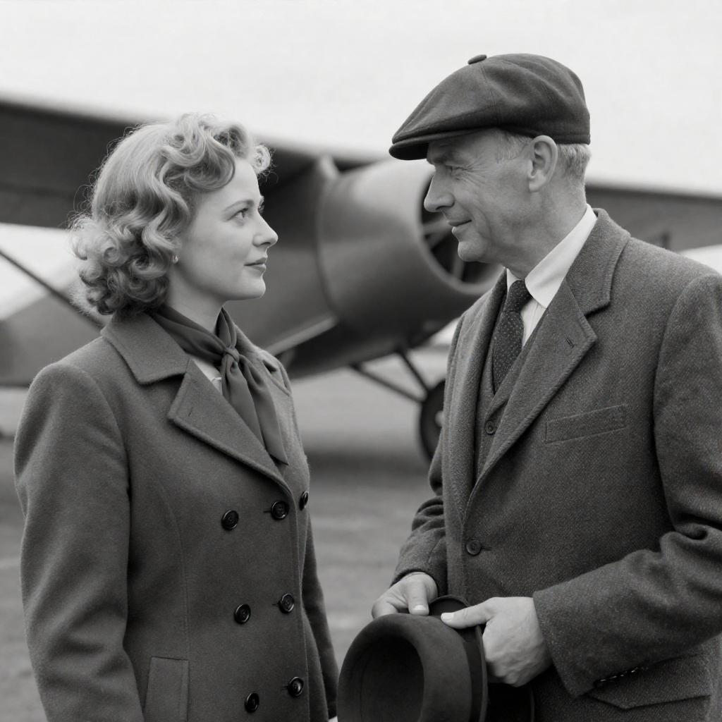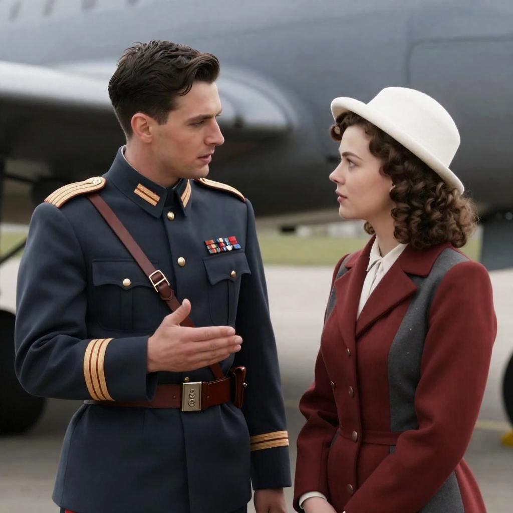 Black-and-white photograph of a romantic moment between a man and a woman on an airfield. The man, in a military uniform with a peaked cap and medals, gazes at the woman. She has wavy blonde hair, wears a light jacket and polka-dot scarf, leaning in towards him. Both smile. He holds a cigarette in his right hand. Background shows an aircraft wing and blurred structures.