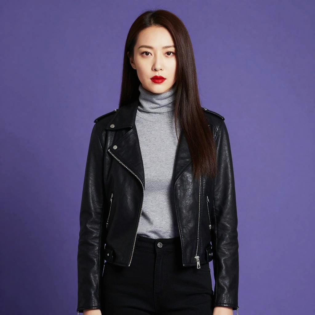 Photograph of an Asian woman with fair skin and long, straight dark brown hair, standing against a solid purple background. She's wearing a black leather jacket with silver zippers over a gray turtleneck and black high-waisted pants. Her lips are painted a bold red, and she has a neutral expression. The lighting is even, highlighting the textures of her clothes and smooth skin.