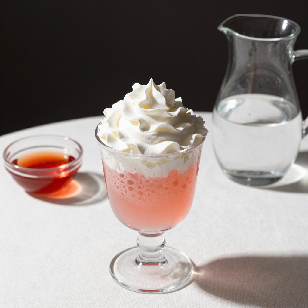 Glass dessert cup with pink, bubbly drink topped with white whipped cream. Small glass bowl with red liquid on the left. Clear glass pitcher on the right. White tablecloth. Dark background. Sunlight casts shadows.