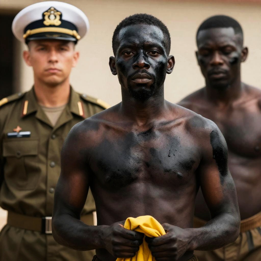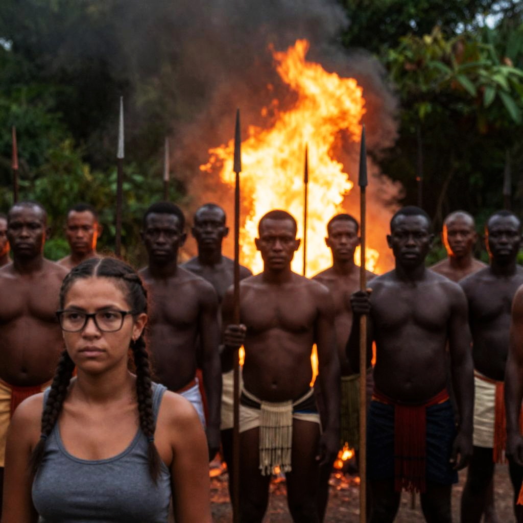Photograph of a group of mostly naked, dark-skinned men with spears, standing in front of large, bright orange fires. Foreground shows a woman with glasses, tank top, and braids, looking to the side. Jungle vegetation in background. Men's expressions are serious. Flames illuminate their bodies, creating contrasting shadows. Group of 12 men, 1 woman.