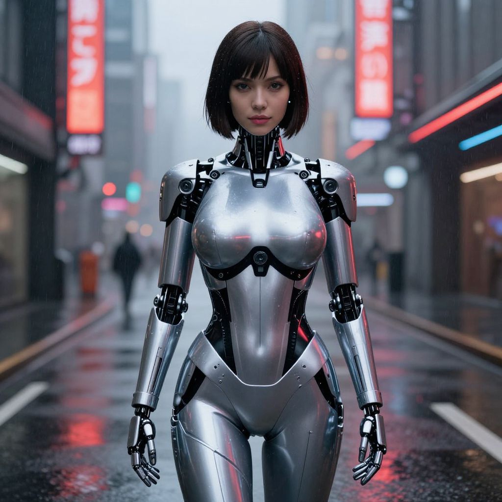 A realistic cybernetic woman wearing a sleek Android woman costume with seamless chrome panels extending from her shoulders to her legs, her face has a sophisticated, slightly robotic yet expressive look with a soft pink lip line and dark, almond-shaped eyes, standing in a rain-slicked futuristic city street under flickering red neon signs.. The woman has big tits and cute face