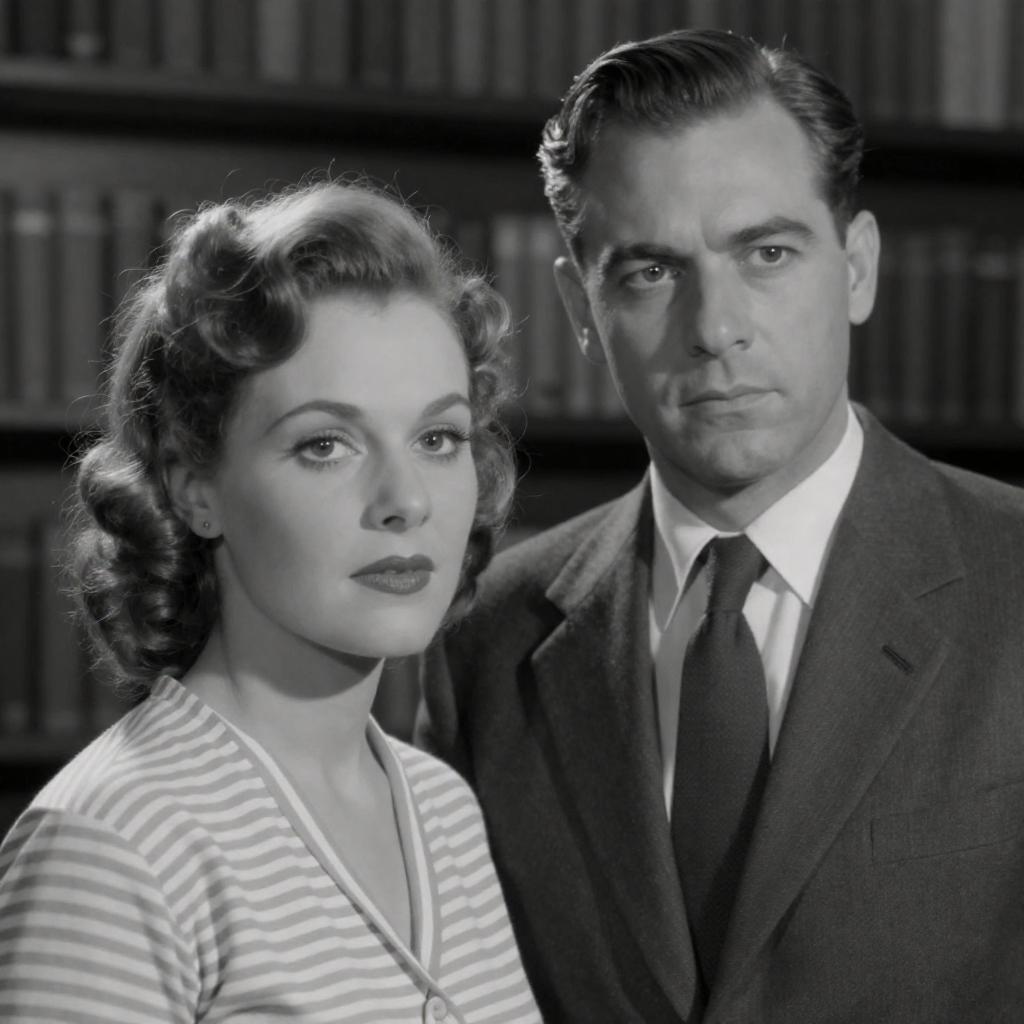 Black and white photograph of a man and woman in 1940s-style clothing. Woman with curled hair, light makeup, neutral expression, wearing striped top. Man with slicked-back hair, dark tie, serious expression, wearing suit. Background with blurred shelves. Man slightly behind woman, both facing forward.