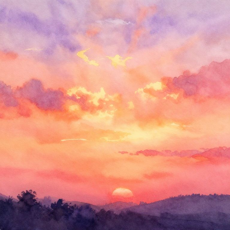 Sunset sky watercolor painting, vibrant hues of orange, pink, and purple blend softly, delicate brush strokes capture the serene atmosphere, wispy clouds reflecting golden light, dreamy and ethereal landscape with distant silhouettes of trees and hills