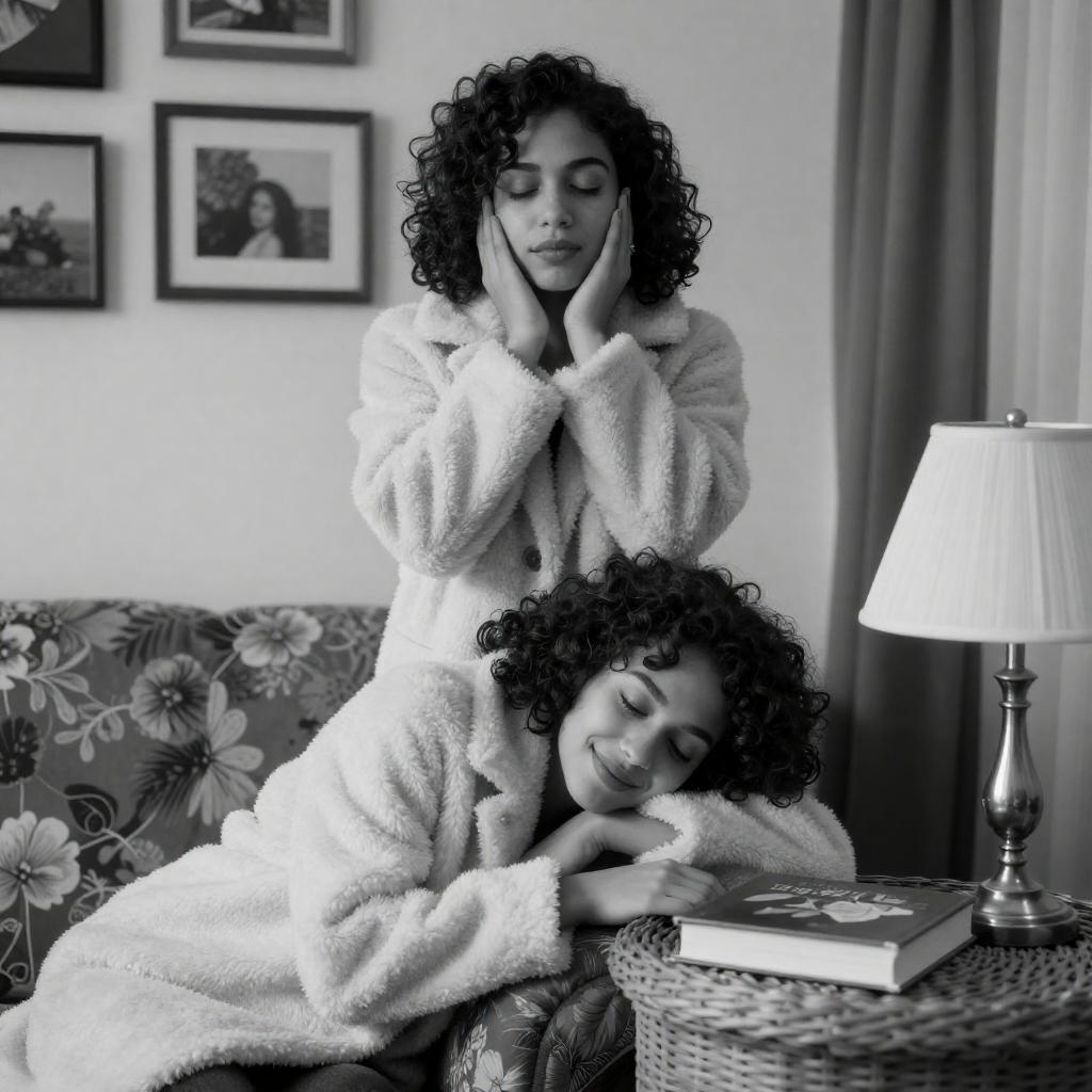 Black-and-white photograph of two women with curly hair on a floral couch. The standing woman wears a fuzzy coat, hands on cheeks, eyes closed. The seated woman, also in a fuzzy coat, rests head on wicker table, smiling. Table with lamp and books. Background with framed pictures and curtains.