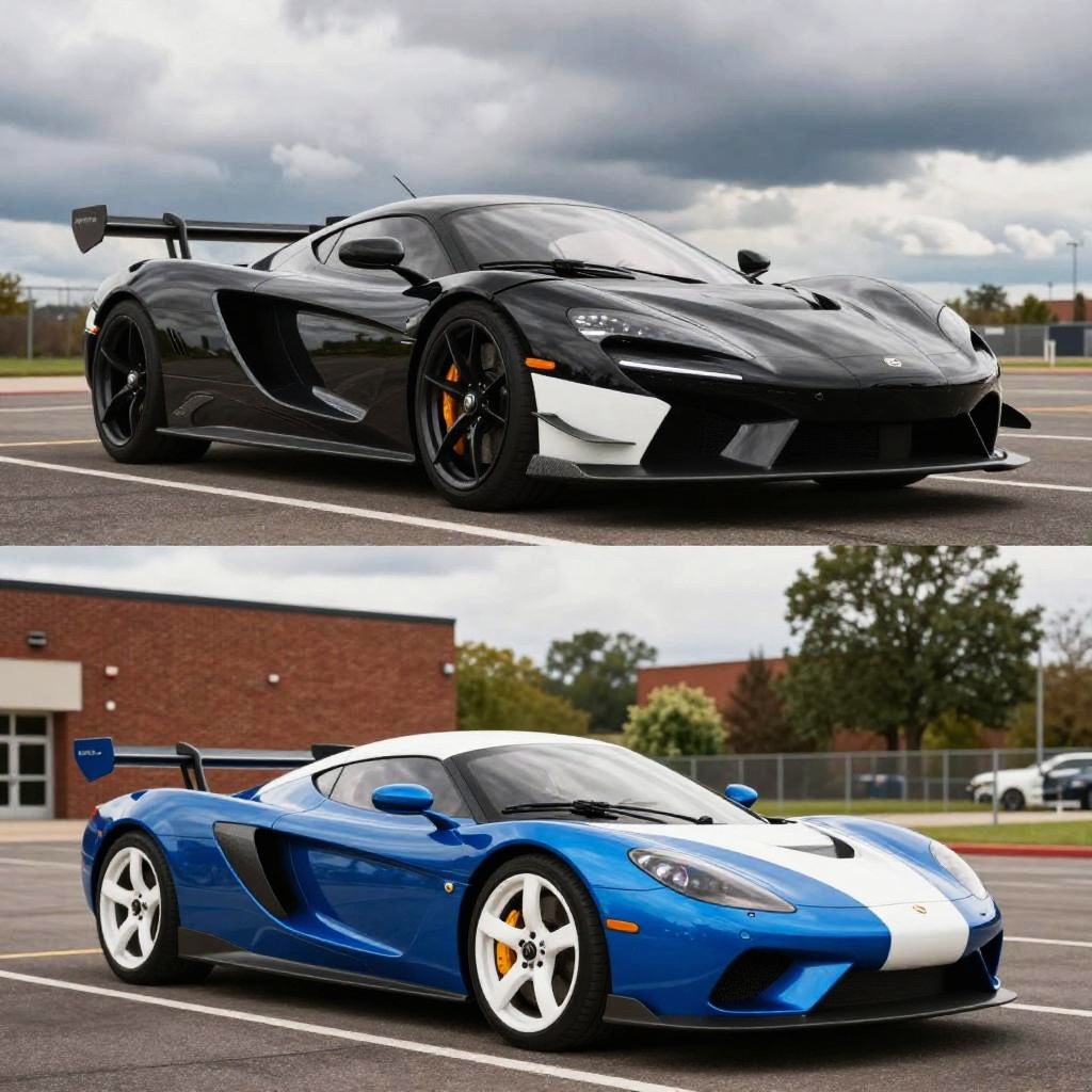 Photograph of a sleek, white sports car with a large rear spoiler parked under a modern, angular overhang. The car is positioned to the right, with a blue sky and green trees in the background. The building on the left has large glass windows and a white, textured wall. Grass plants are near the building's base. The scene is brightly lit with natural sunlight.