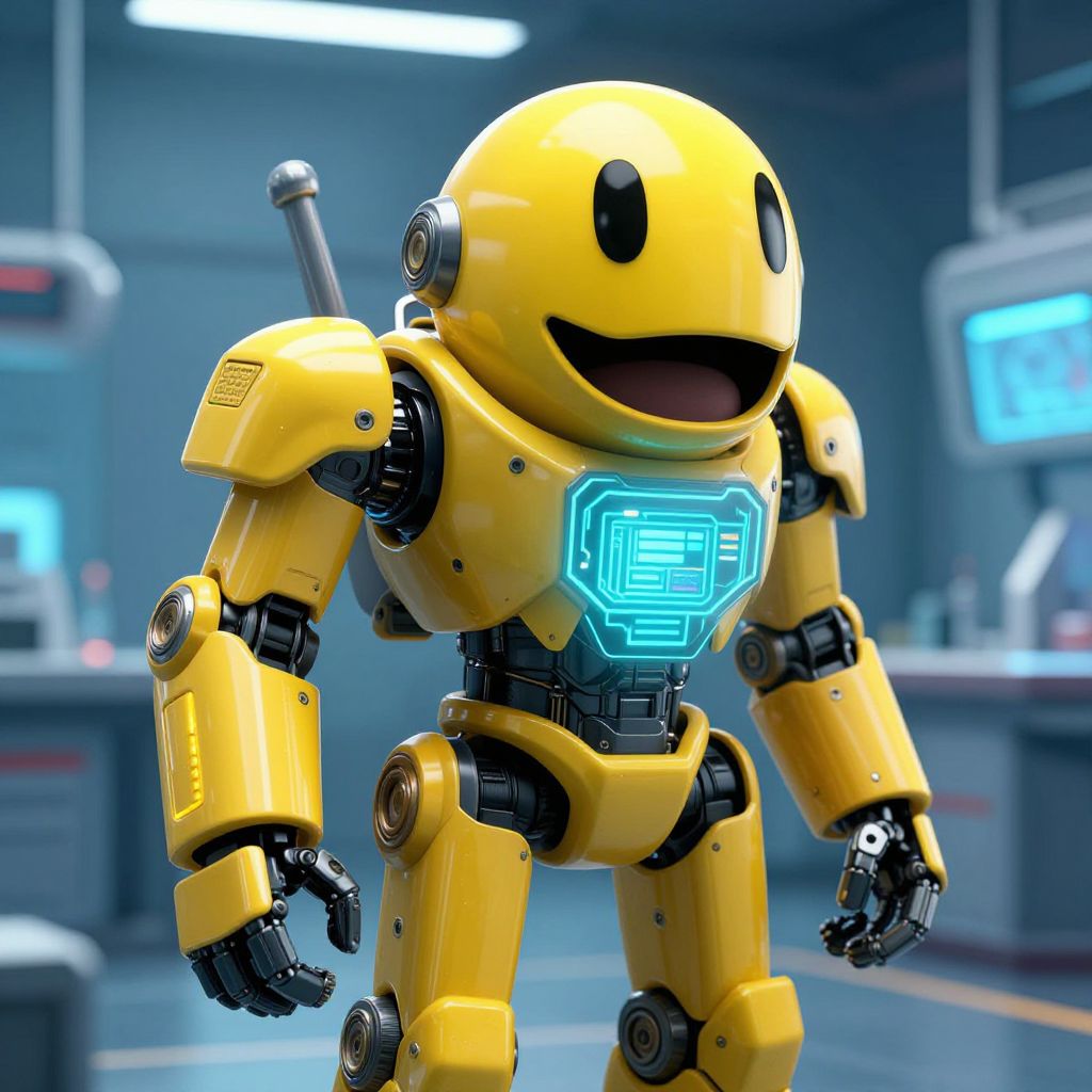Pacman suit designed as a high-tech exoskeleton, combining classic arcade elements with futuristic robotics, illuminated yellow panels and holographic interface on the chest, set in a sci-fi laboratory environment, hyper-realistic digital rendering.