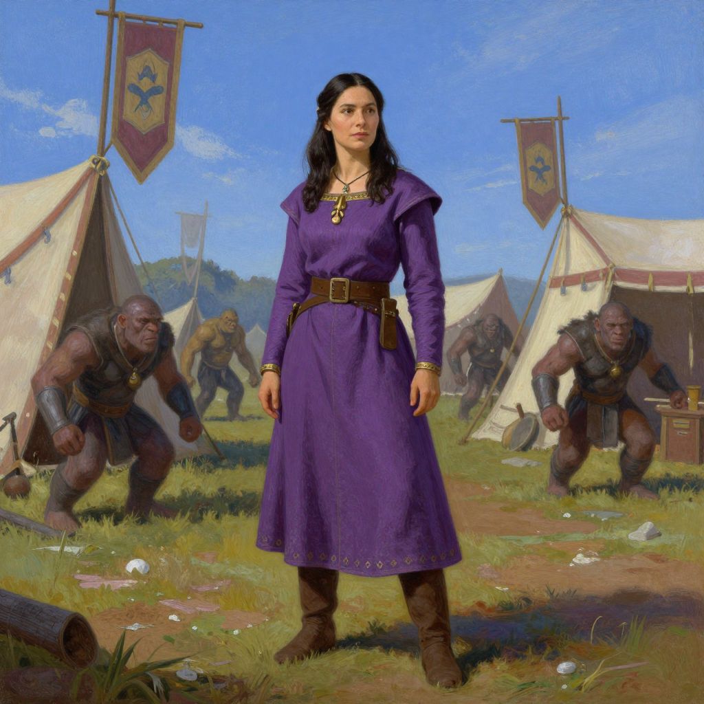 Digital painting in a fantasy style depicts a young woman with long black hair, fair skin, and a serious expression, standing in front of two medieval-style tents with blue and yellow banners. She wears a purple long-sleeve dress with a brown belt and brown boots. Two muscular, dark-skinned, orc-like warriors with aggressive postures and leather armor are in the background. The ground is grassy with scattered debris, and the sky is clear blue. The scene exudes a sense of tension and readiness. The woman's dress is adorned with a cross necklace, adding a touch of contrast to her surroundings.