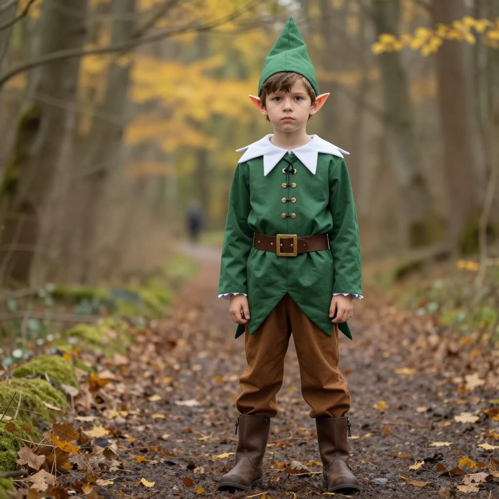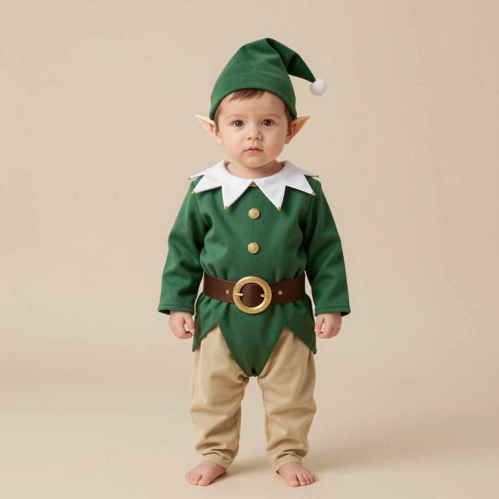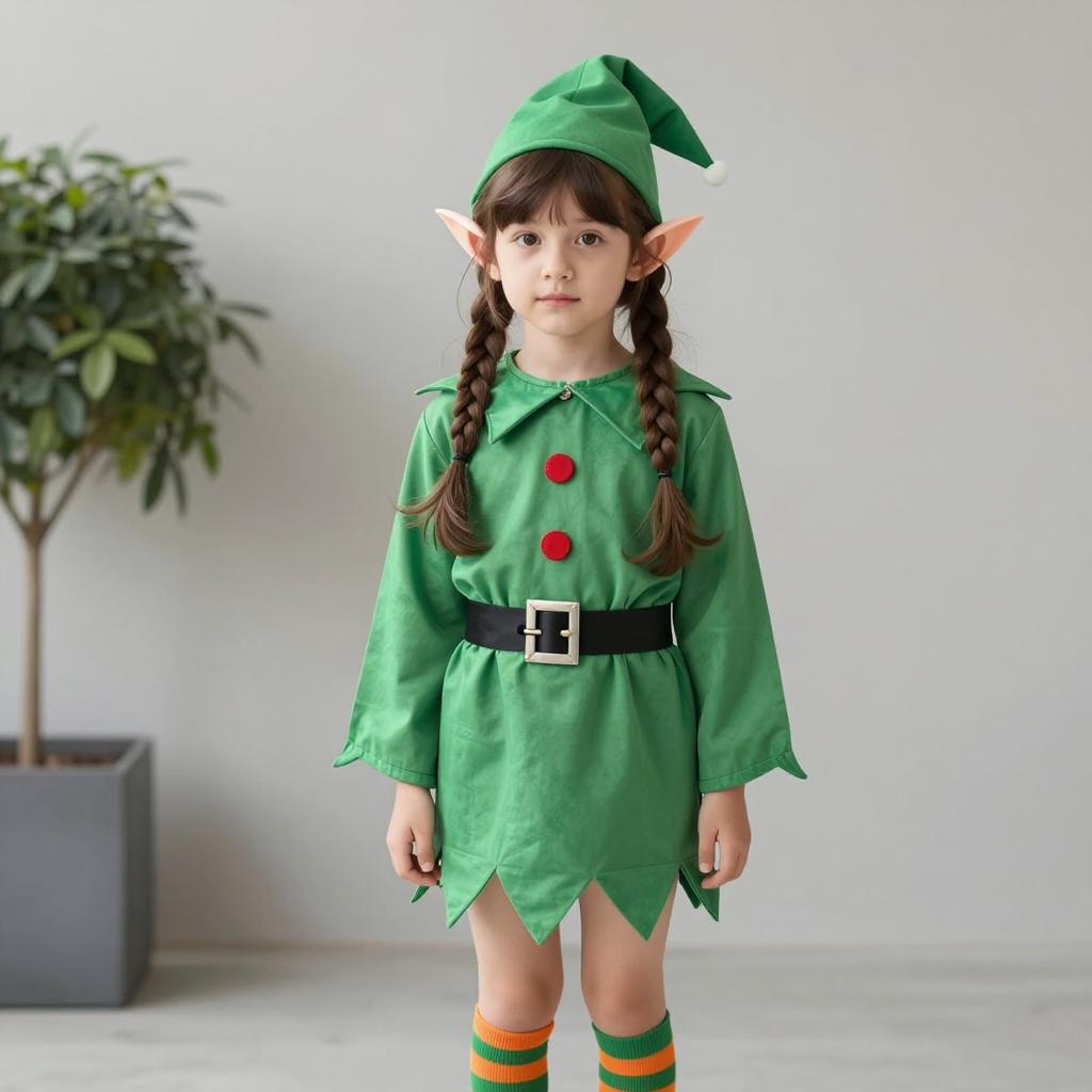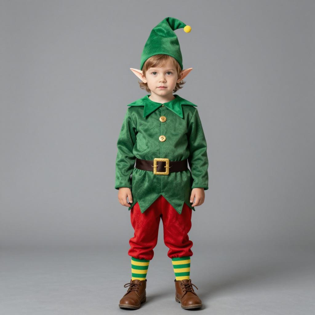 Toddler elf costume, photograph of a young child dressed as an elf, standing against a gray studio background, wearing a green pointed hat with a yellow tip, green long-sleeve tunic with a brown belt and gold buckle, red pants, green and yellow striped socks, brown shoes, gray background, full body, realistic, detailed, child with pointed ears, neutral expression, slight shadow on the ground