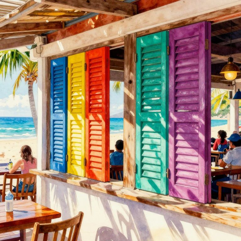 Colorful tropical louvers installed in an open-air beachside restaurant, vibrant hues with sunlight streaming through wooden slats, lively atmosphere with palm trees and ocean in background, watercolor painting style with rich textures and shadows