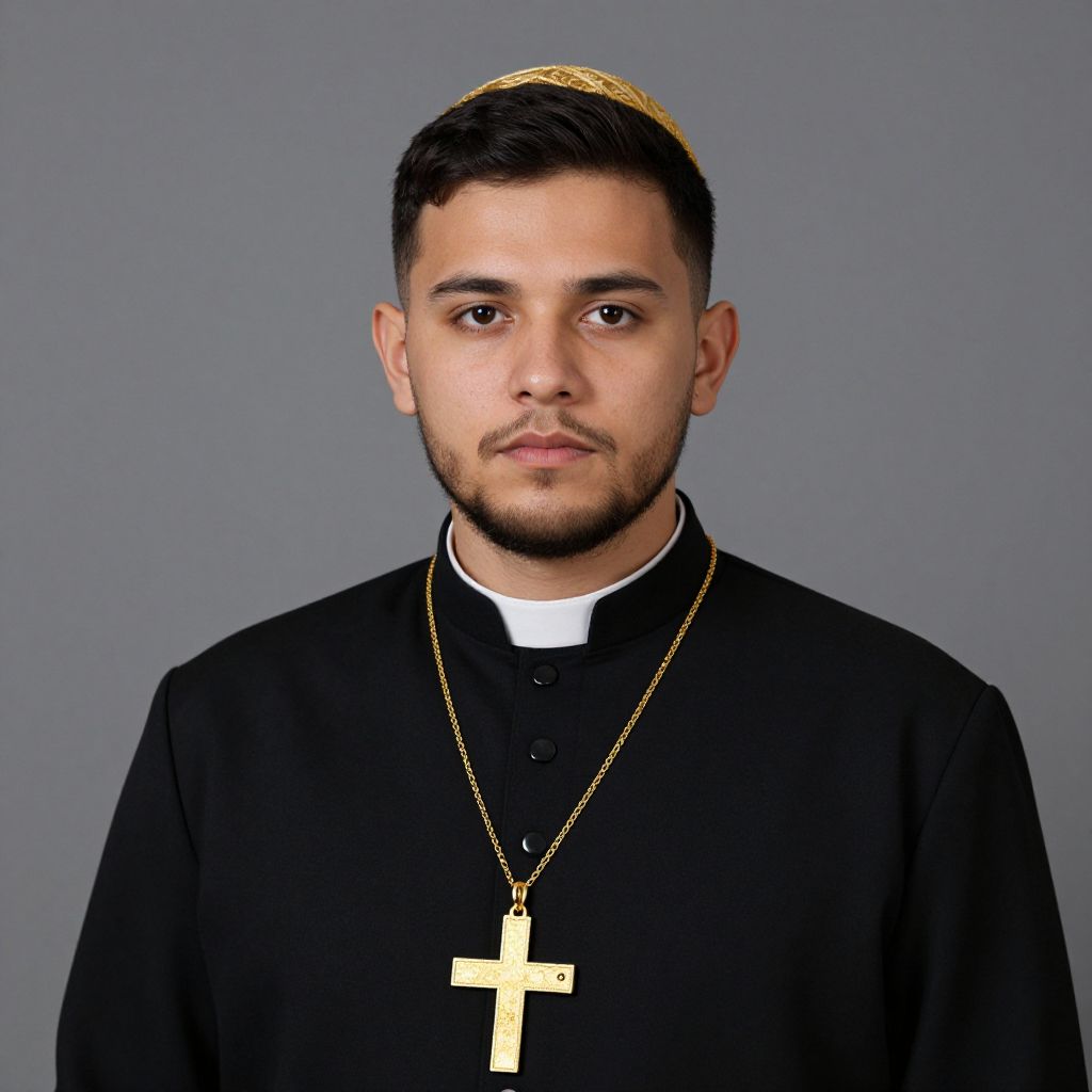 Photograph of a young man with a medium build, light olive skin, and dark brown eyes, standing against a plain gray background. He has a trimmed beard and is wearing a gold, patterned mitre, a black clerical robe, and a gold cross necklace. His serious expression is focused, and he looks directly at the camera. The image has a formal, studio-lit feel.