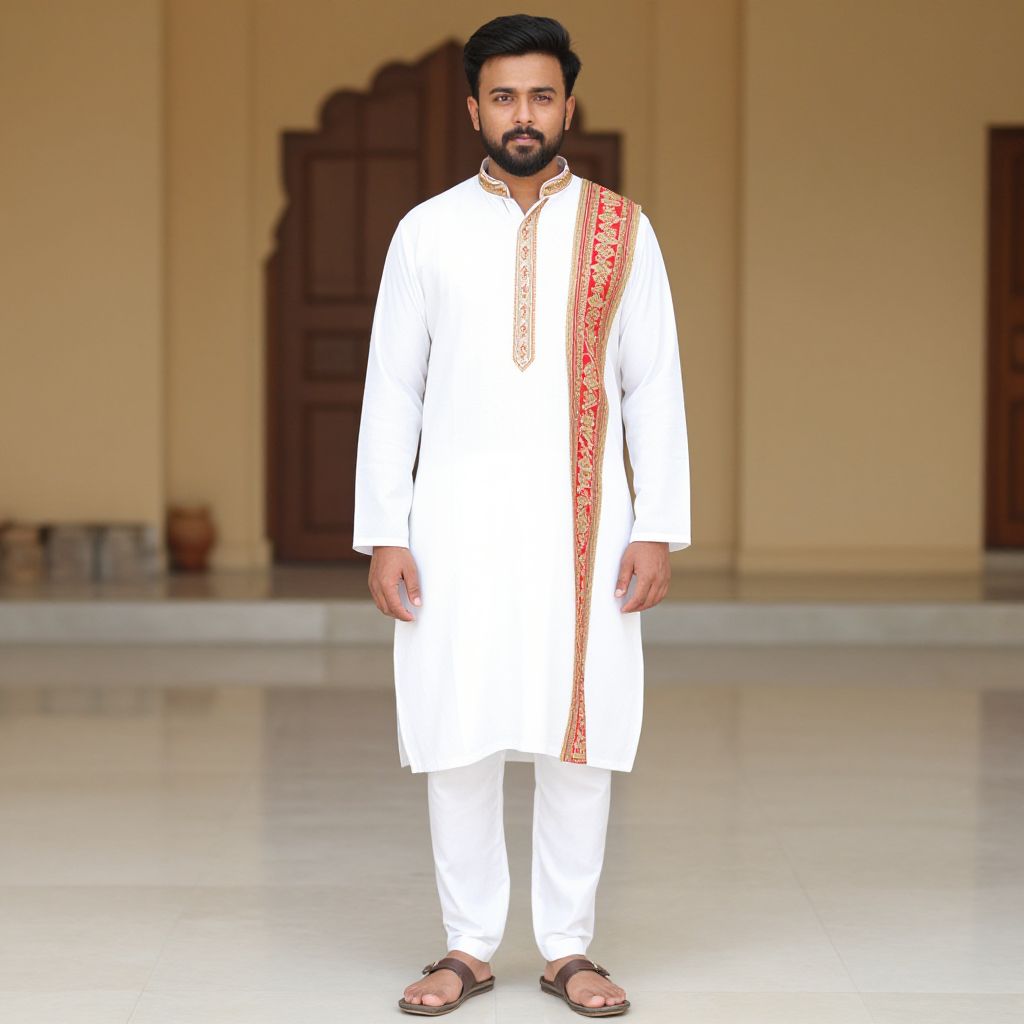 Man with black hair and beard wearing a white kurta with a red and gold embroidery on the right side. He is also wearing a pair of sandals on his feet.