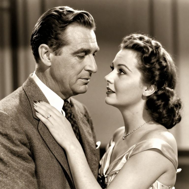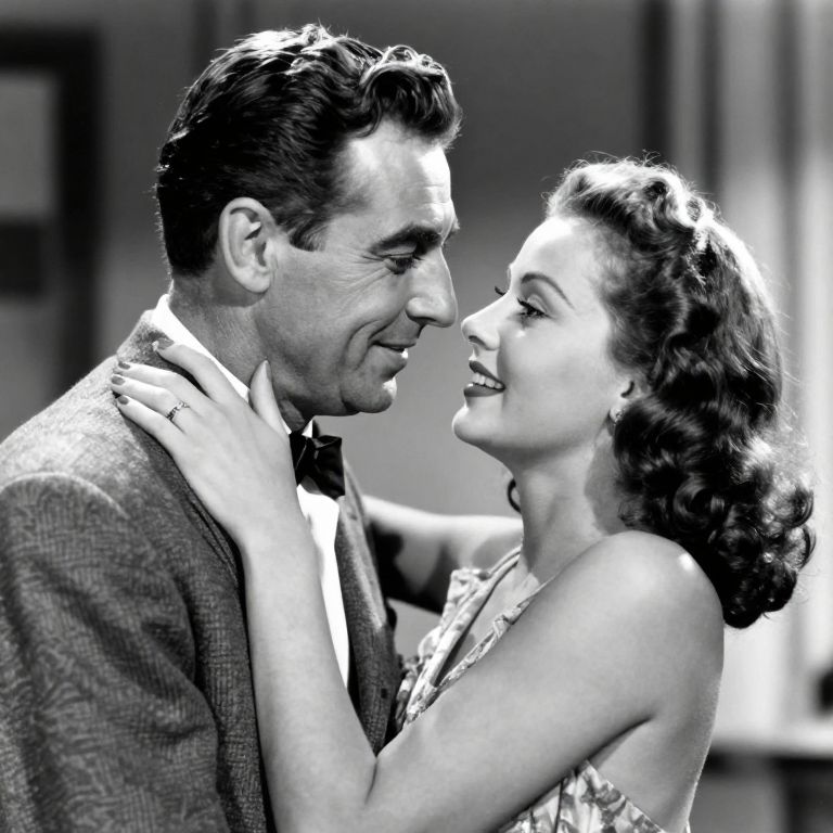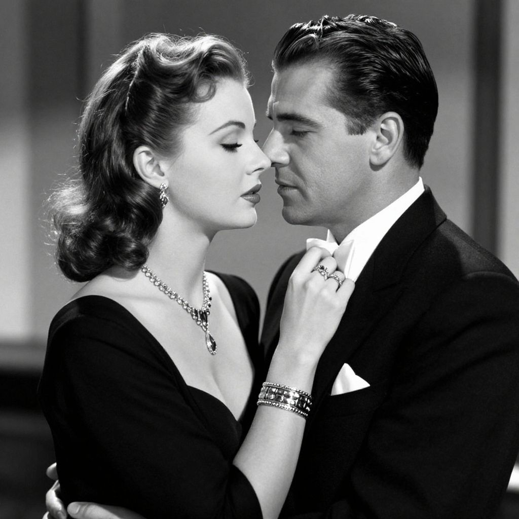 Intimate close-up from *Brief Encounter* (1945), featuring a woman in a light blouse and pearl earrings gazing at a man in a dark suit and bow tie, both sharing a poignant moment against a dimly lit backdrop.