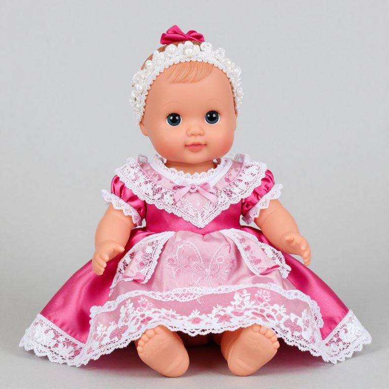 Photograph of a realistic baby doll with large blue eyes, wearing a pink satin dress with white lace trim and a white lace headband with a pink