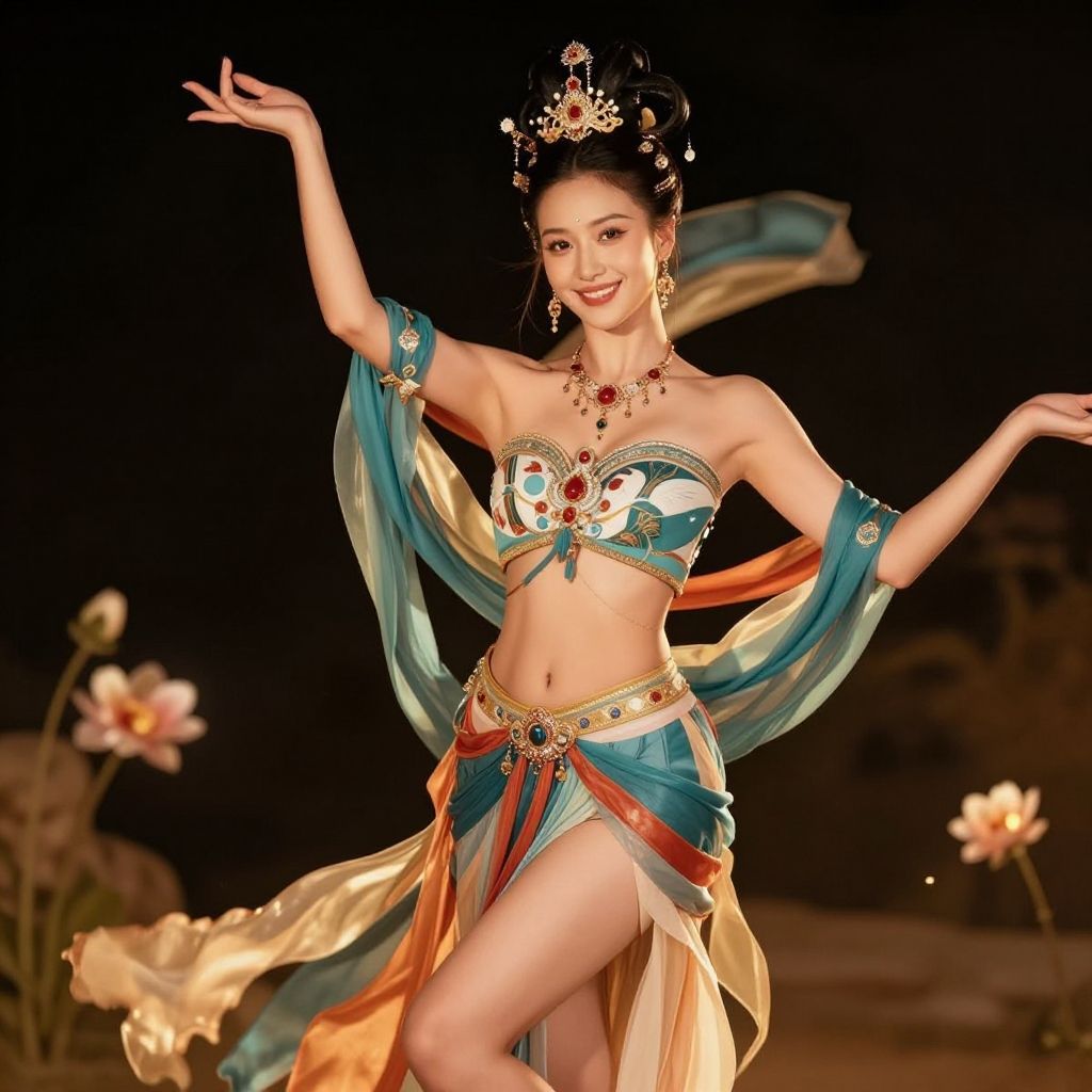 (goddess-like happiness, flirtatious, seductive:1.4), (RAW photo:1.2), (photorealistic:1.6), (ultimate quality, masterpiece:1.3), (intricate details:1.2), (detailed face:1.2), dramatic, ray tracing, fashion photograph, fFaceDetail, Full body, good hands, Sharp focus, cinematic lighting, Jessica Alba, (dunhuang, dunhuang_face, Chinese Dunhuang Flying Fairy, floating clothes, floating flower, pov legs, thighs, dunhuang cloths, hanfu, waist cape, strapless, navel, robe:1.2), (1girl, solo, outdoors, night time, dancing:1.6), confident smile, beautful face, (large breasts, narrow waist:1.2), sexy body, perfect body, shiny hairs, hair ornament, earrings, necklace, jewelry, confident, showcasing, buzzing atmosphere