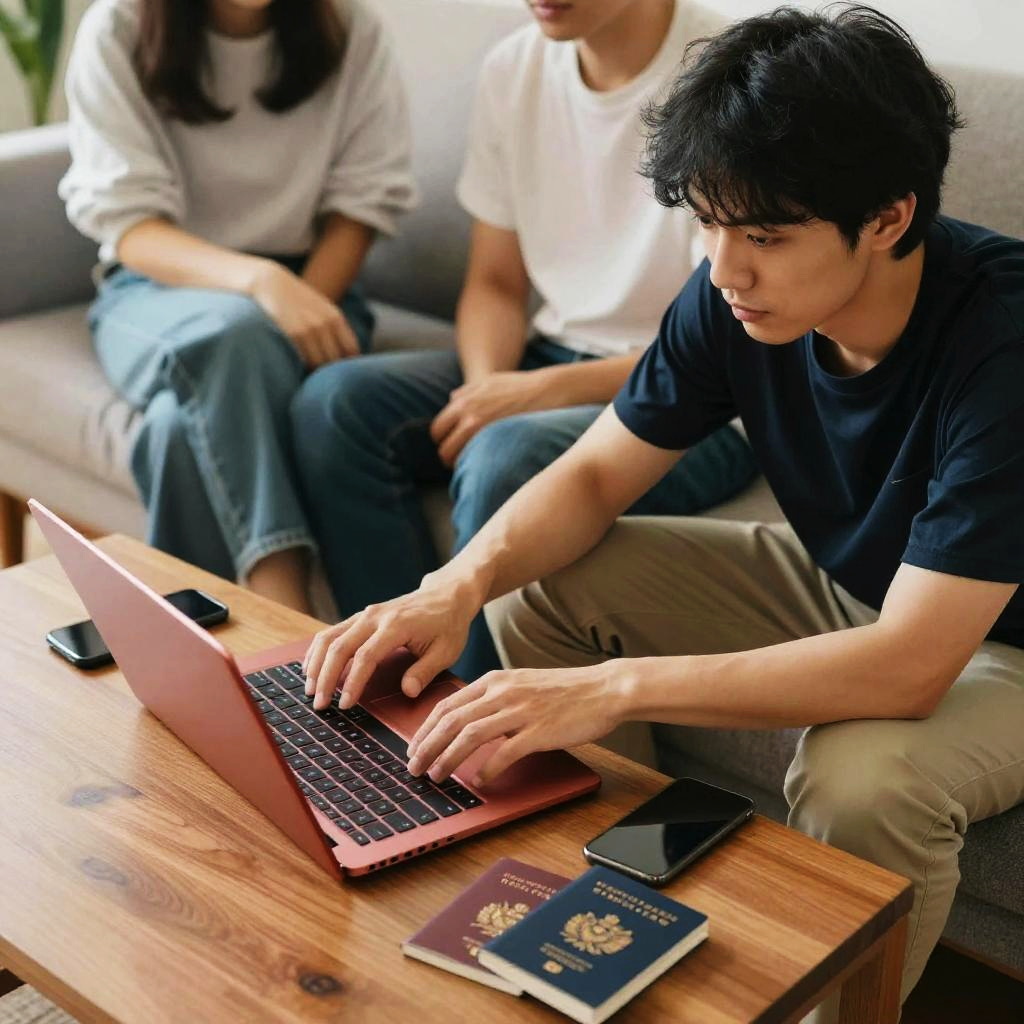 Three people sitting on a couch in a cozy living room, one person using a red laptop on a wooden table, two smartphones and two passports on the table in warm natural light, casual clothing, relaxed atmosphere
