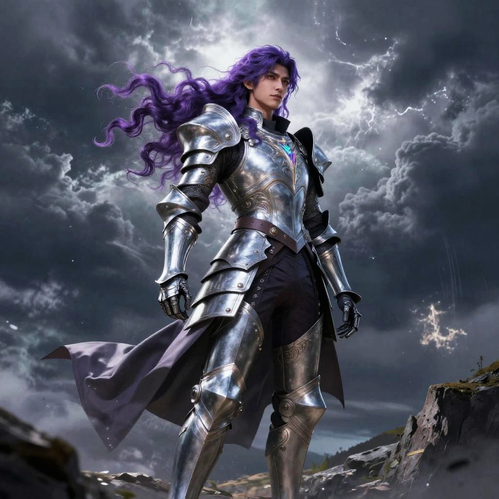 Fantasy character with voluminous purple wavy hair, wearing elaborate silver armor, standing on a cliff during a storm, dramatic clouds and dynamic lighting, high detail