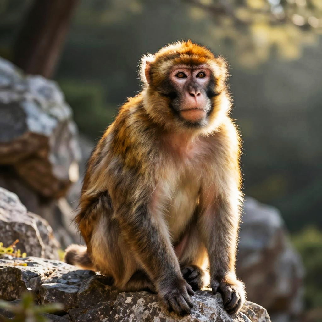 Curious barbary macaque observing intently on rocky Mediterranean forest with dappled sunlight, in vibrant documentary-style wildlife photo; heroic stance, warm rim light, detailed textures and fine fur/skin, expressive eyes, atmospheric perspective, low-angle dramatic view, leading lines, balanced rule-of-thirds composition, soft background separation, high dynamic range feel, ultra sharp subject, natural color grade, subtle haze, microcontrast on edges, immersive realism, SDXL, 8k resolution