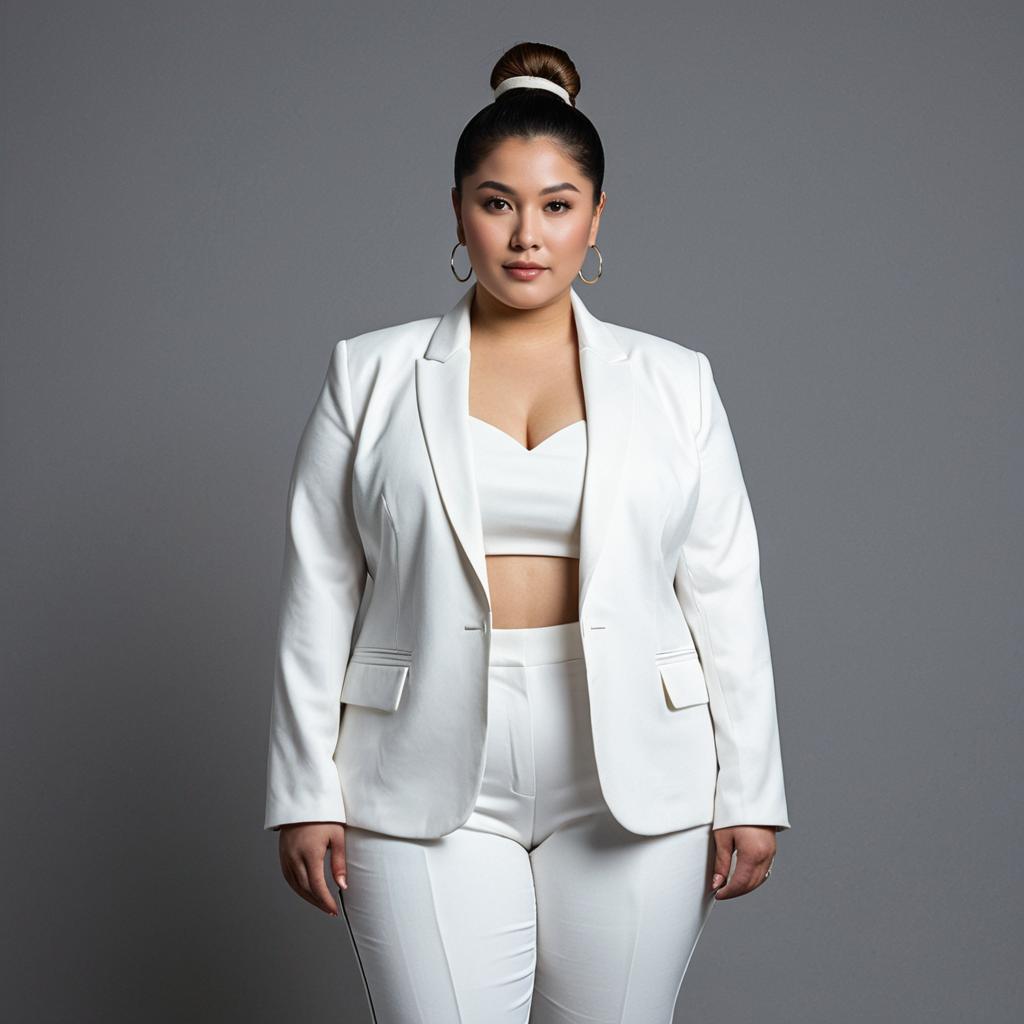 Plus size white suit costume,1girl, solo, realistic, earrings, jewelry, hoop earrings, suit, formal, pants, jacket, hair bun, white pants, single hair bun, looking at viewer, grey background, asian, standing, simple background, brown eyes