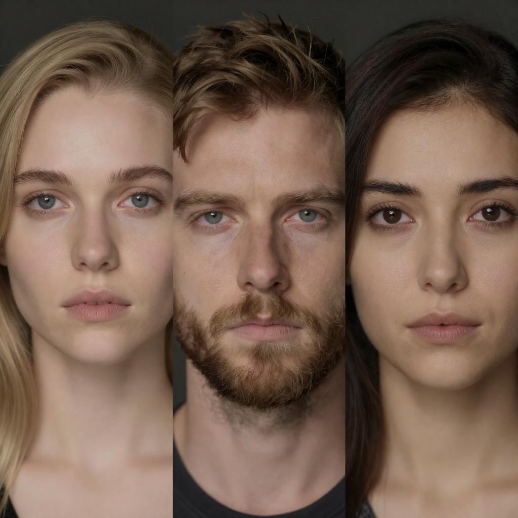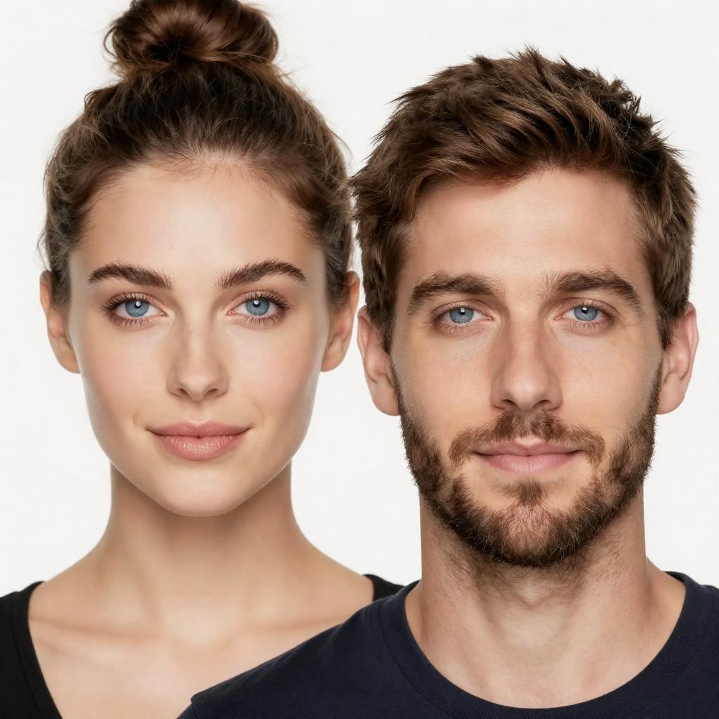 Photograph of a close-up, split face of a bearded man with green eyes on the left and a woman with green eyes on the right. Central black vertical panel with white mathematical equations and diagrams. Both subjects have neutral expressions.