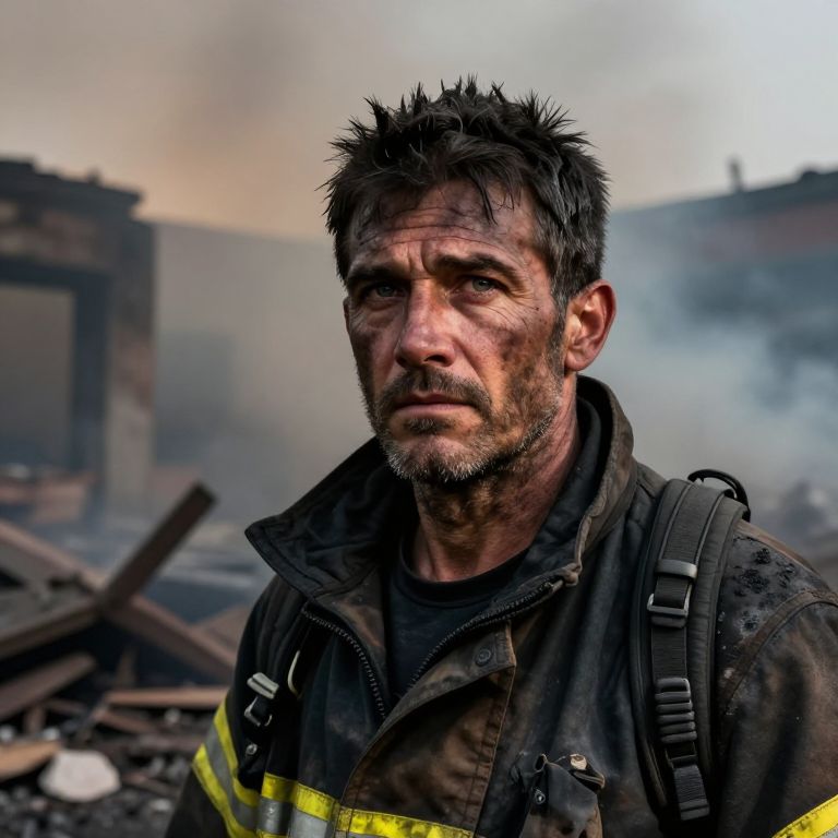 An iPhone portrait captures a seasoned firefighter's intense gaze amidst smoky ruins. His rugged features, framed by soot-covered hair and weary expression, rise like a phoenix from the ashes. This unique perspective showcases an emotional gradient, transitioning from despairing backdrop to determined eyes filled with hope. The charred uniform tells tales of heroism and resilience as gentle light filters through debris, casting dramatic shadows across his weathered face, emphasizing creases etched by time spent saving lives on the front lines.