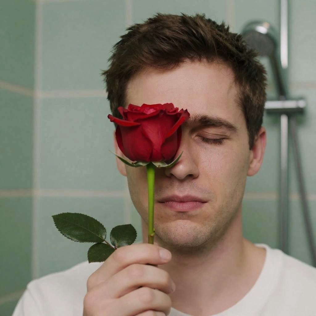 Close-up of a man with short brown hair, eyes closed, holding a red rose with green leaves against his forehead. A metallic showerhead is on the right side, attached to a green-tiled wall. Man's face shows slight discomfort.