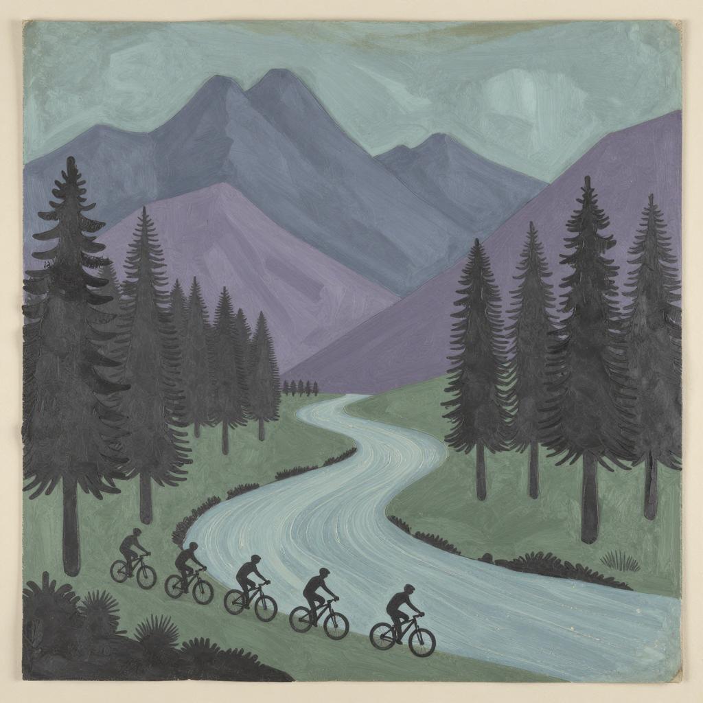 Paper Mache In the style of Pierre Bittar, create a vintage design of a mountain landscape with a winding river and tall trees. Use muted shades of blue, green, and purple to capture the atmosphere of the scene. Include a group of black silhouettes of mountain bikers riding along the riverbank.,