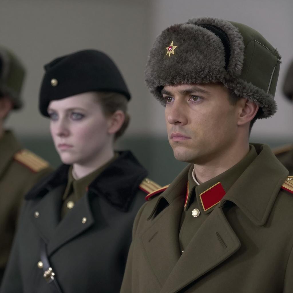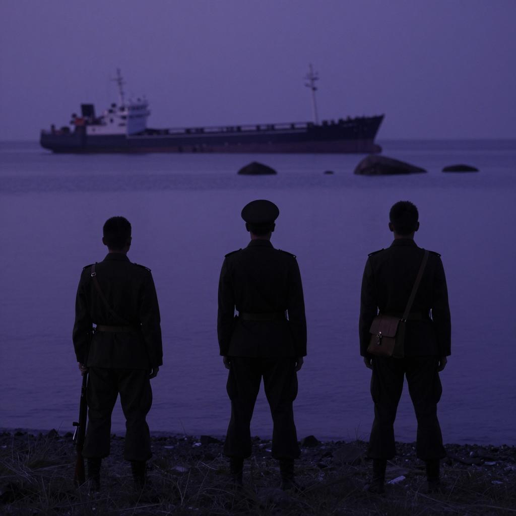 Three soldiers in dark uniforms stand on a grassy shore at night, facing a calm, purple-tinted sea. One soldier on the left holds a rifle, one in the center wears a peaked cap, and the soldier on the right has a satchel. A dark ship is in the background with several small rocks in the water. The soldiers are silhouetted, with no visible facial expressions. The image has a dark, moody visual style.