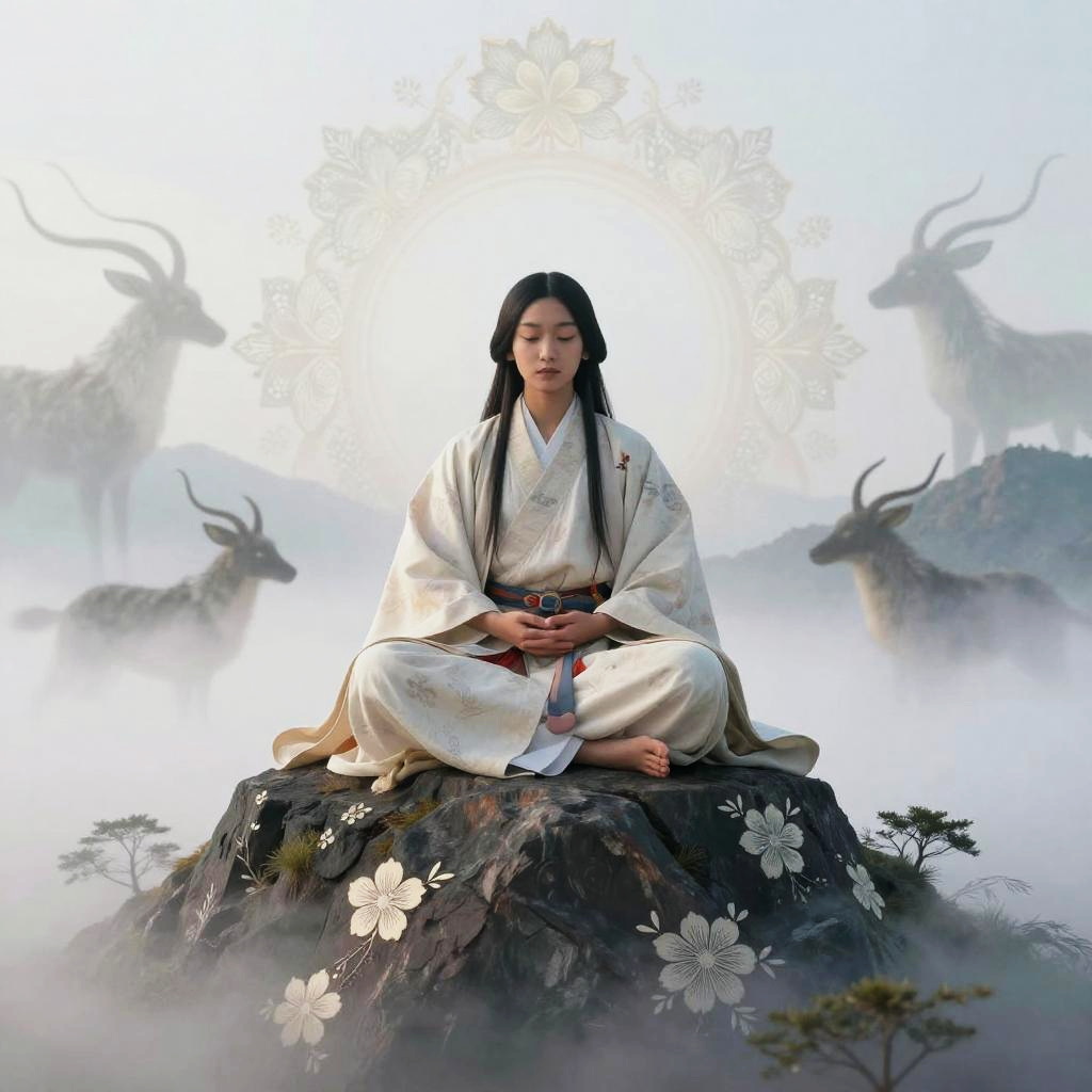 Kamuy depicted as a serene shamanic figure meditating atop a sacred mountain, enveloped by mystical fog and delicate floral motifs, traditional Ainu robes flowing, with faint ghostly animal companions in the background, evoking a peaceful connection to nature and ancestral spirits.