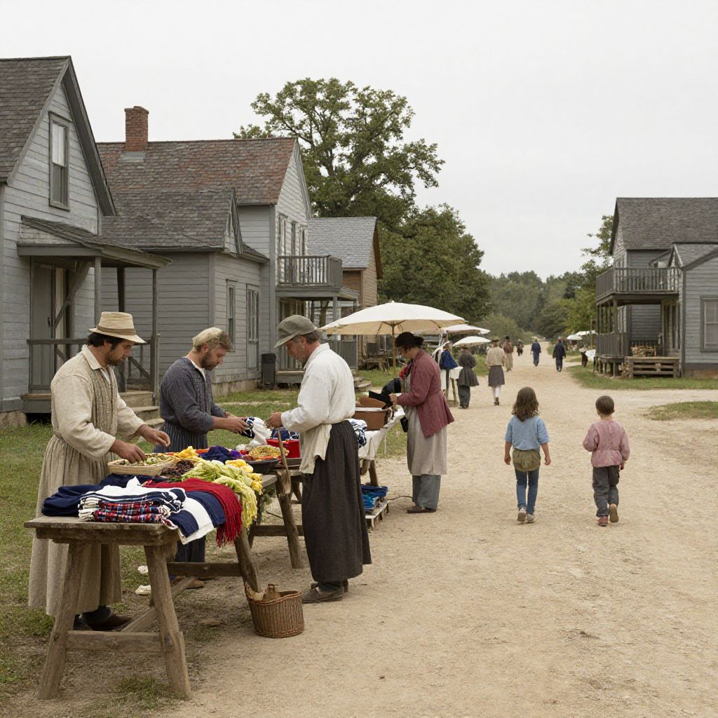 1720s colonial American street market, vendors in rustic clothing selling produce and textiles, wooden stalls, dirt roads, children playing, early wooden buildings, muted earthy colors with bright accents from fabrics, capturing daily life of the era