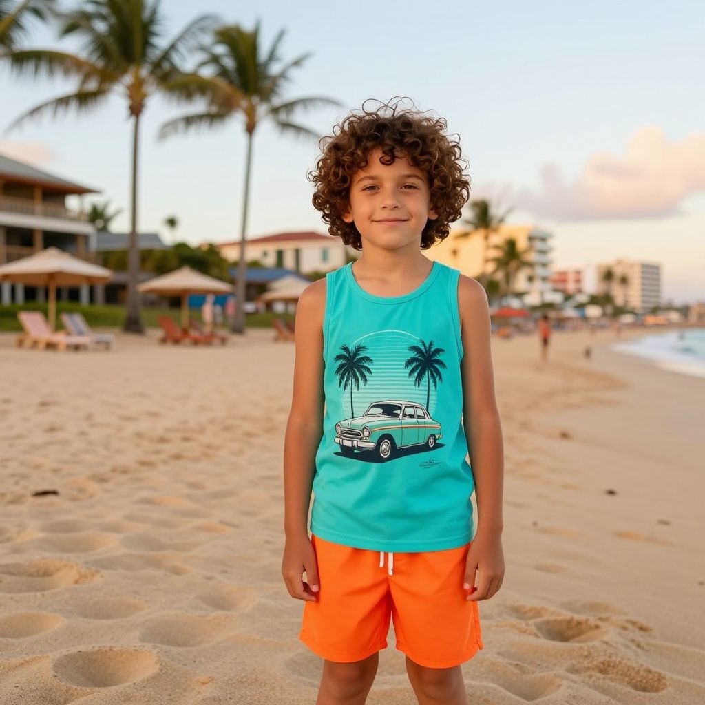 Photograph of a young boy with curly brown hair standing on a sandy beach at sunset. He wears a bright turquoise tank top with a graphic of a vintage car and palm trees, and orange shorts. The background features several palm trees, beach chairs, and multi-story buildings with balconies. The sand is light beige, and the sky is a gradient of soft pink and orange hues. The boy stands in the center, slightly smiling, with a relaxed posture. The image has a slightly blurred, vibrant, and colorful aesthetic.