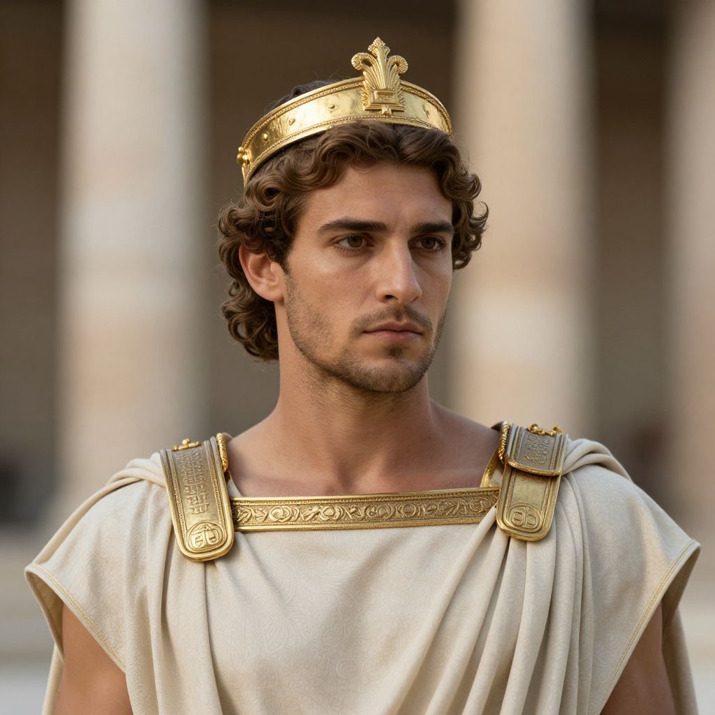 Ancient greek clothing male, a close up of a man in a roman costume with a gold crown
