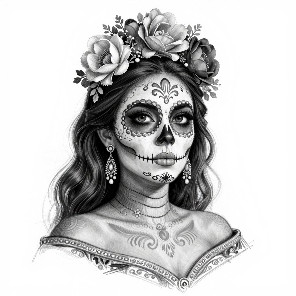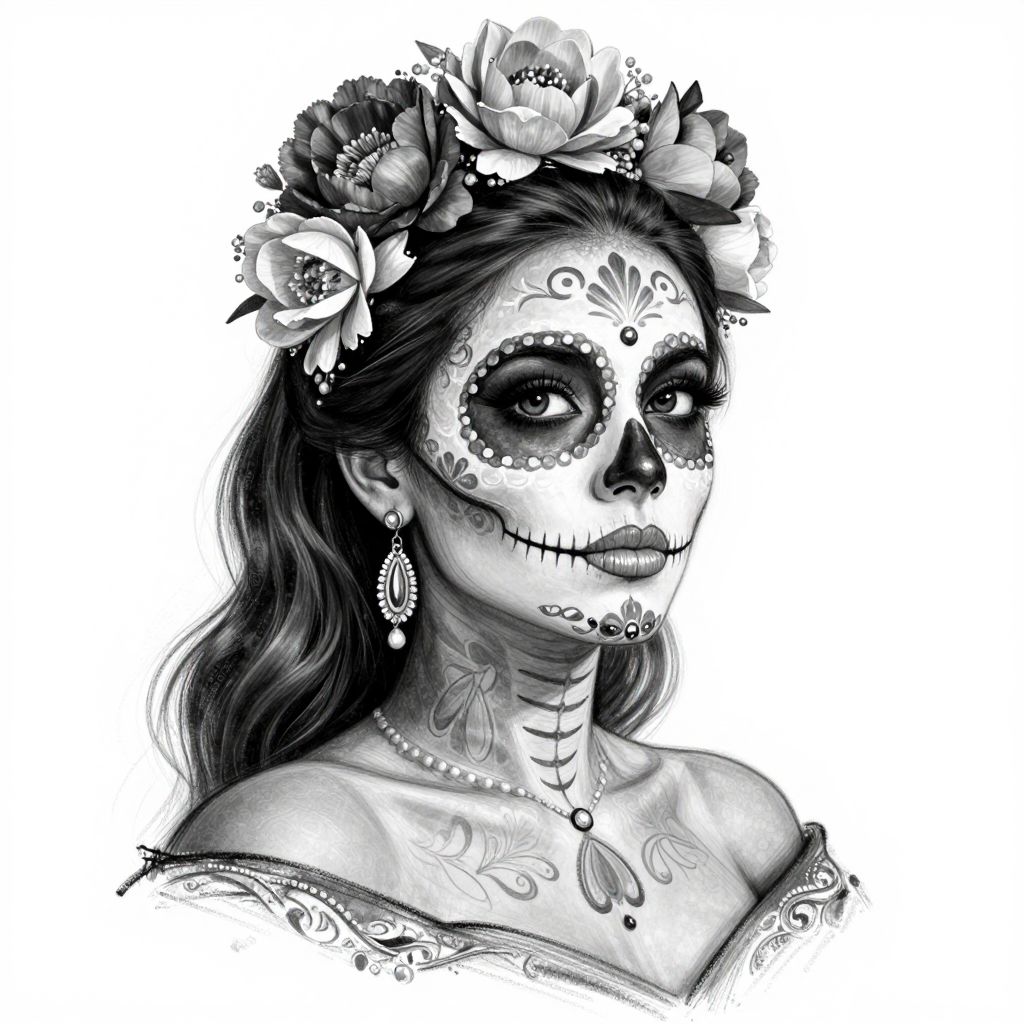 A detailed black-and-white digital art sketch featuring a woman adorned with intricate sugar skull makeup, floral hair accessories, and elegant neck tattoos, showcasing a blend of traditional Mexican Day of the Dead aesthetics and modern artistic flair.