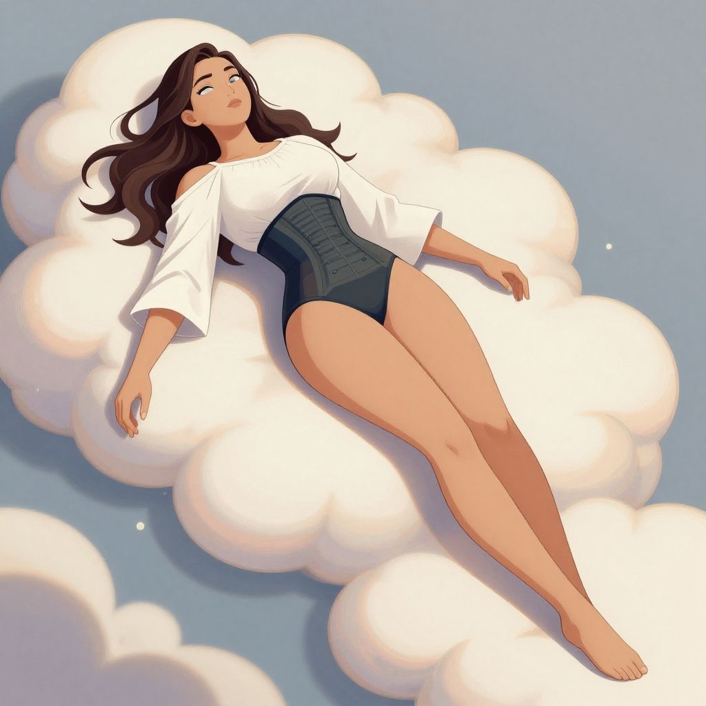 This digital illustration features a full-body depiction of a woman in a semi-fantasy style, lying back among soft clouds. The character wears a stylish, high-waisted corset and a loose white top, blending elements of modern and fantasy aesthetics with detailed shading and clean line work under soft daylight.