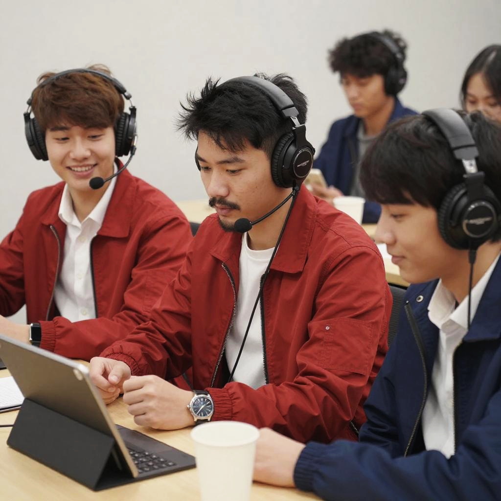 Three young Asian men and one young Asian woman sitting indoors around a table wearing headphones with microphones. Two men are wearing red jackets and one man is wearing a blue jacket. They are focused on a tablet PC on the table, with a white disposable cup also visible. The men have short black and brown hair, some with facial hair including mustache and beard, dressed in collared shirts and casual jackets.
