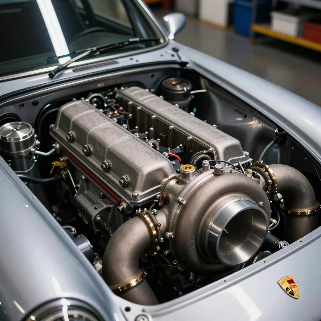 Ottomotor in action, a detailed cross-section of a four-stroke internal combustion engine, showing pistons, crankshaft, valves, and spark plugs in a realistic style with metallic textures and dynamic lighting, emphasizing mechanical precision and engineering complexity.