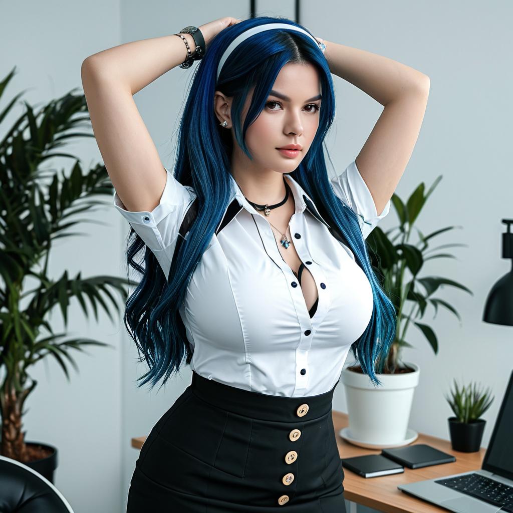 Portrait of a young woman with long blue hair and brown eyes wearing a white collared shirt tucked into a high-waist black pencil skirt with buttons. She has a white hairband, a black choker necklace, and wristwatch. The woman poses indoors in an office setting with potted plants and a laptop on the wooden desk in the background. She has an expressionless face and her arms are raised with hands behind her head.