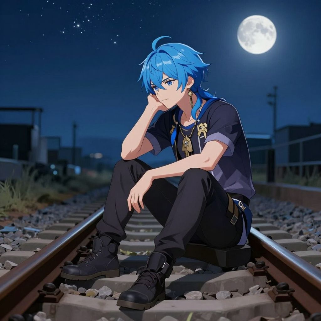 Honkai star rail blue hair guy sitting on rail track under starry sky, contemplative expression, soft moonlight, futuristic yet calm setting, detailed shading and color contrast