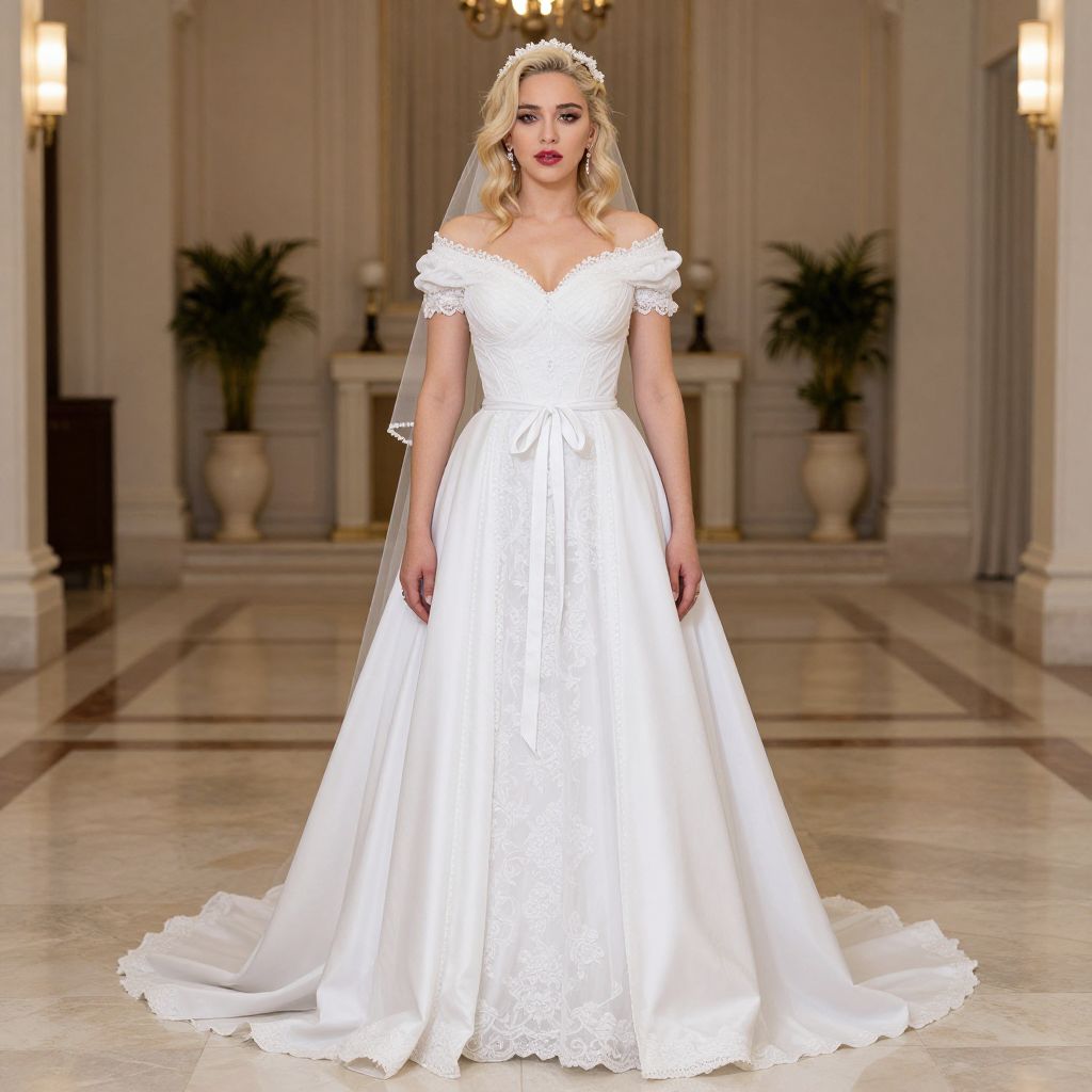 Madonna White Dress Costume, bride in white gown and tiable standing in a hall
