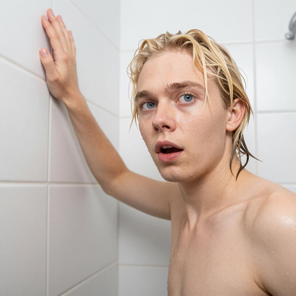 Shirtless person with wet blonde hair, light skin, and blue eyes, standing in a white-tiled shower. Left hand raised against wall, mouth slightly open, expression of surprise or alarm. Bright lighting, visible droplets on skin.