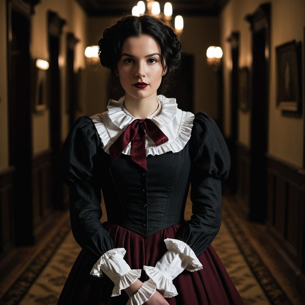 Victorian era fashion male, photorealistic, Victorian-era woman, standing, full body, brown leather corset jacket, high waist, green satin skirt, white lace cuffs, bow tie, stern expression, brown wavy hair, brick building background, daylight, urban setting, historical clothing, realistic ures, detailed, no CGI effects, natural lighting