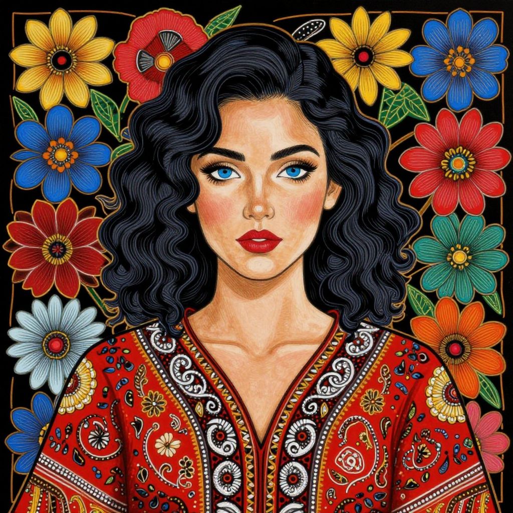 This vibrant digital drawing features a striking portrait of a woman with fair skin, blue eyes, and wavy black hair adorned with a red flower. She wears a red, patterned blouse with intricate white and yellow designs. Surrounding her are colorful, large flowers in shades of yellow, blue, red, and green, set against a black background. Her red lipstick contrasts with her pale complexion, and her expression is calm yet confident. The artwork has a bold, colorful style reminiscent of pop art, with crisp lines and vivid hues.