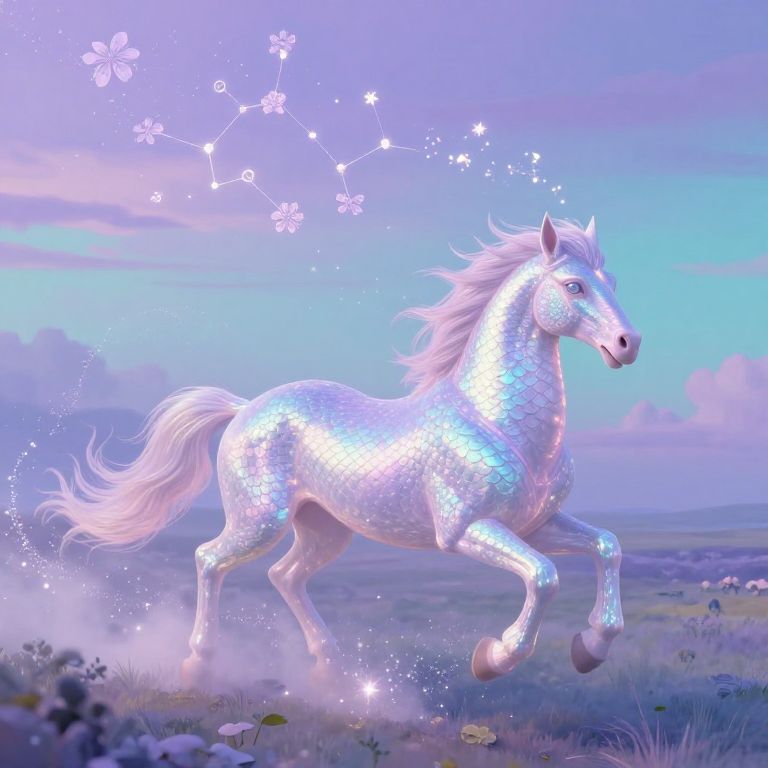 An enchanting digital art piece depicts a majestic mythical creature with iridescent scales gracefully galloping through an ethereal landscape bathed in soft pastel hues of lavender and turquoise twilight. From a unique aerial perspective, the scene reveals delicate floral constellations suspended within the sky, tracing the path of the magical creature as it leaves a trail of shimmering stardust. The creature's expression is one of serene nobility, eyes reflecting both wisdom and wonderment, evoking an emotional gradient that spans tranquility to awe-inspiring enchantment in this captivating symphony of color and light.