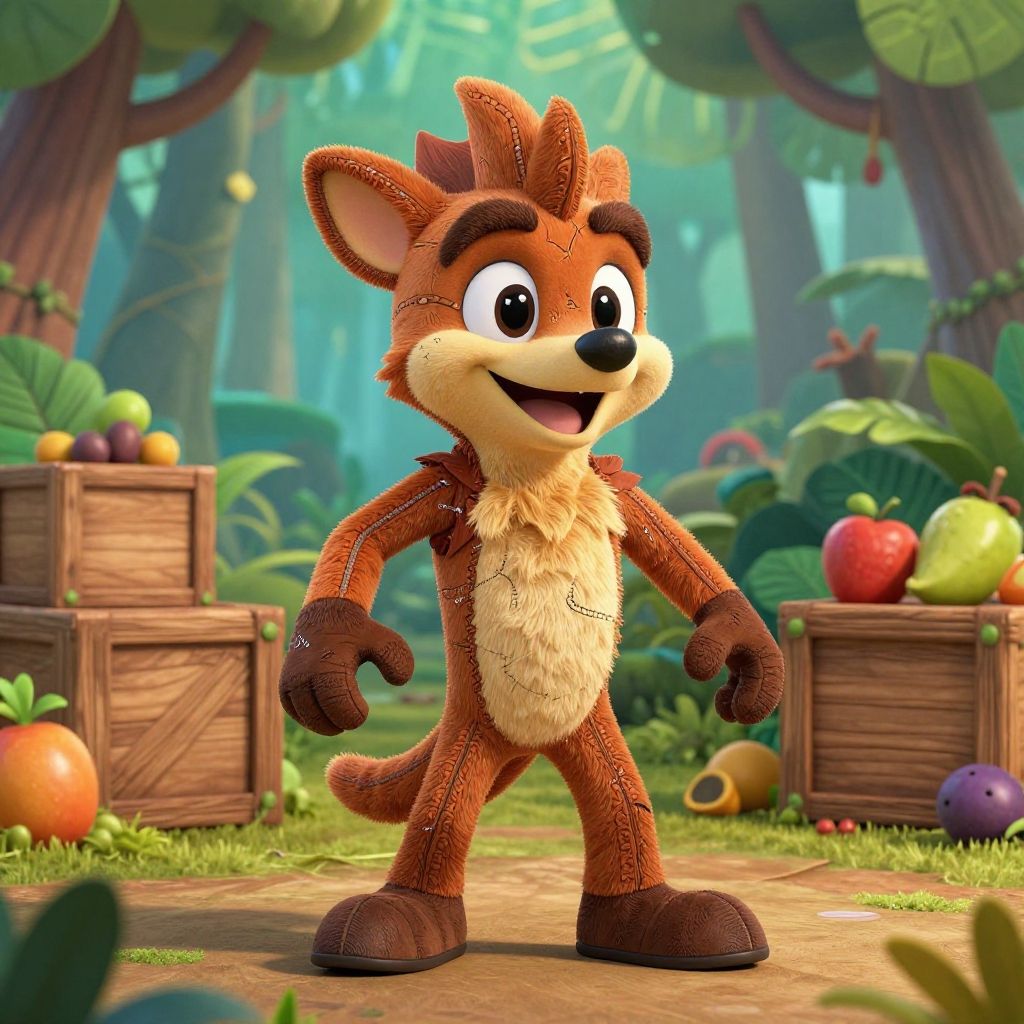 Realistic Crash Bandicoot costume worn by a playful character in a colorful forest, showcasing intricate stitching and plush fur effects, surrounded by animated wooden crates and tropical fruits, lively and energetic atmosphere with soft shadows.