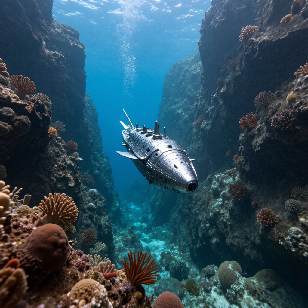 An ethereal vessel glides through a vibrant underwater canyon, its metallic form a paradox of human ingenuity amidst the organic symphony of coral and marine life, evoking a sense of wonder and introspection about humanity’s place within the boundless depths of nature.