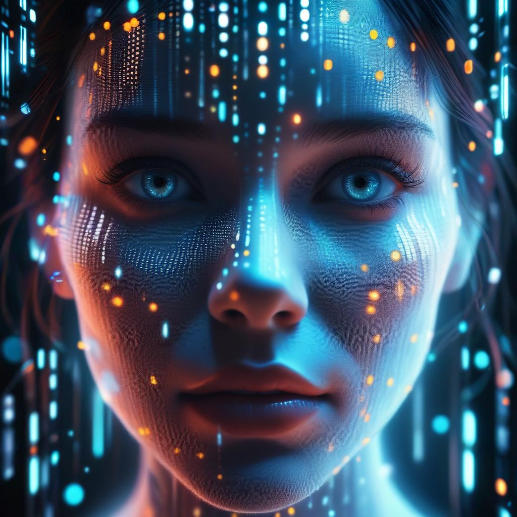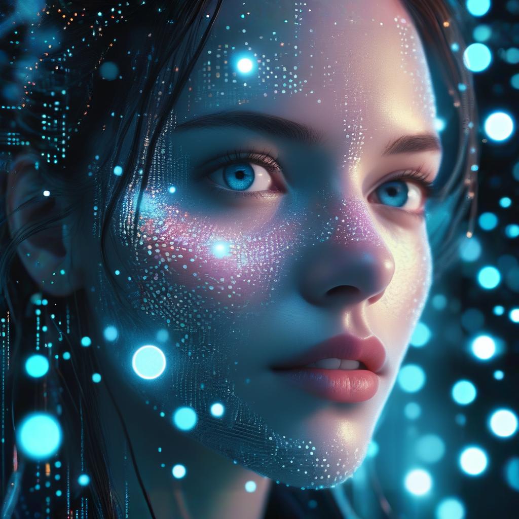 A detailed close-up of a female face emerging from a matrix of shimmering digital dots. The face is composed of glowing LEDs, giving the illusion of materializing from a digital cloud. The ethereal, cybernetic aesthetic features a lively atmosphere.